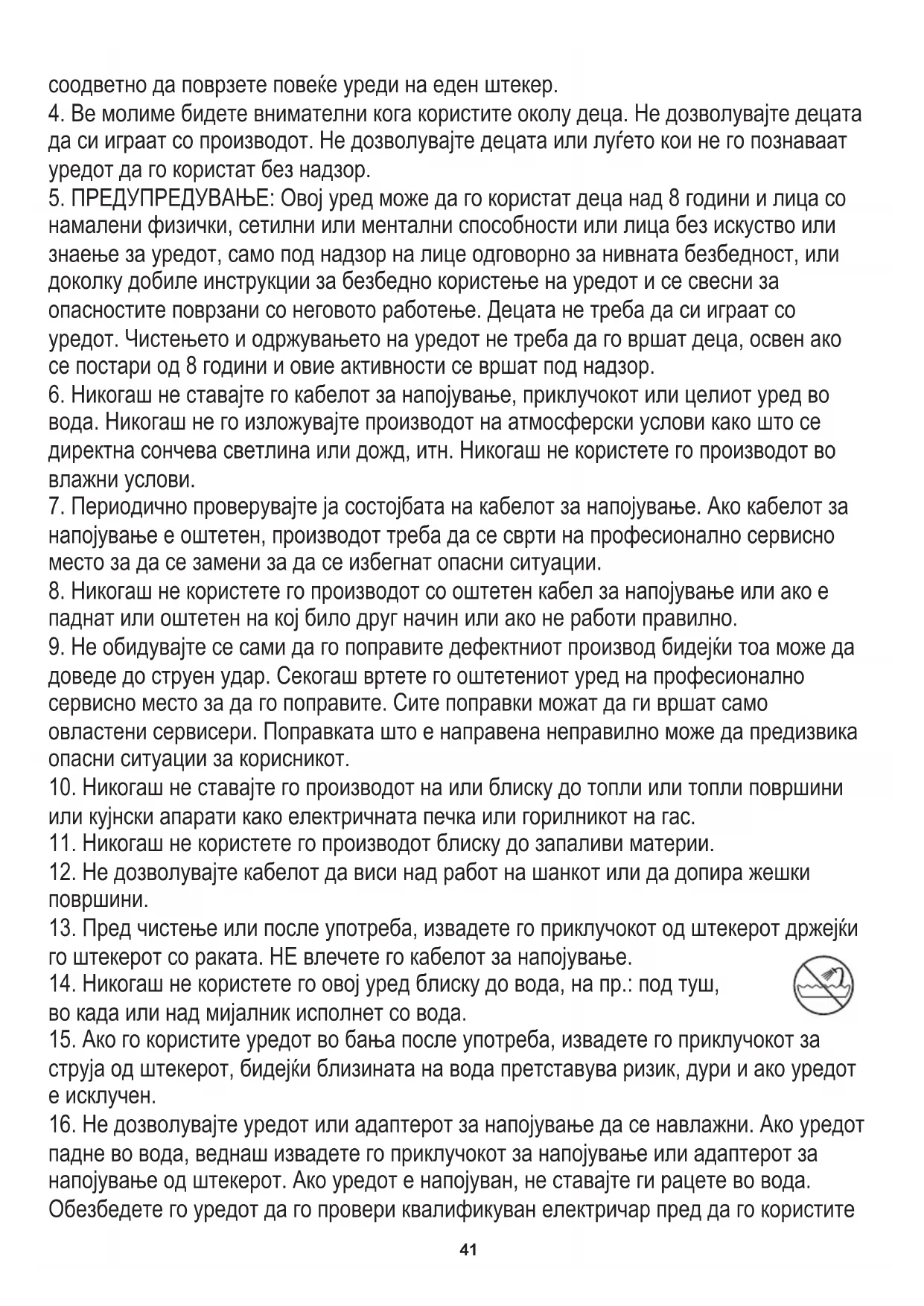 14. Никогаш не користете го овој уред блиску до вода, на пр.: под туш,