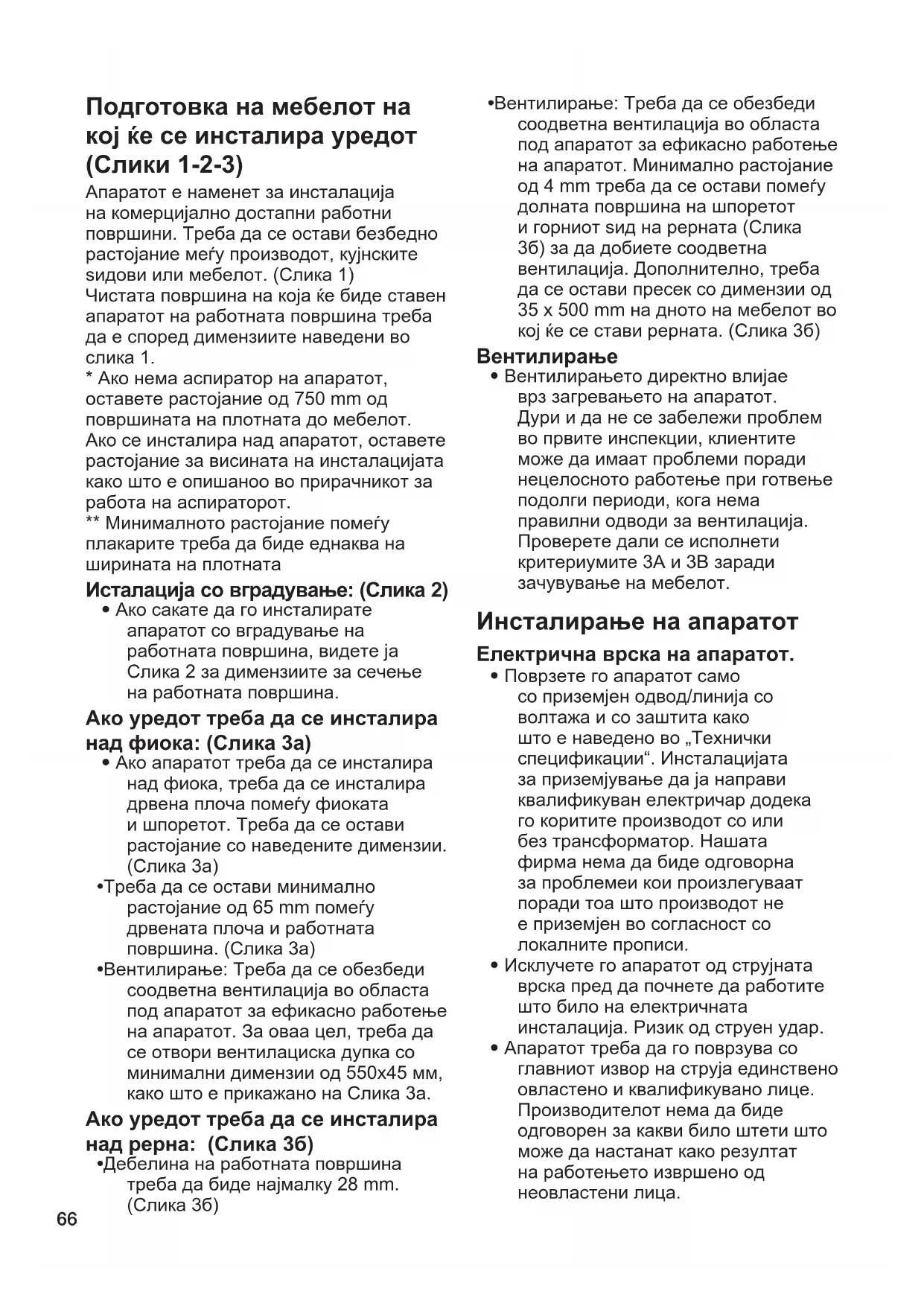 - Вентилирањето директно влијае врз загревањето на апаратот. Дури и да не се забележи проблем во првите инспекции, клиентите може да имаат проблеми поради нецелосното работење при готвење подолги периоди, кога нема правилни одводи за вентилација. Проверете дали се исполнети критериумите 3А и 3B заради зачувување на мебелот. Инсталирање на апаратот Електрична врска на апаратот.