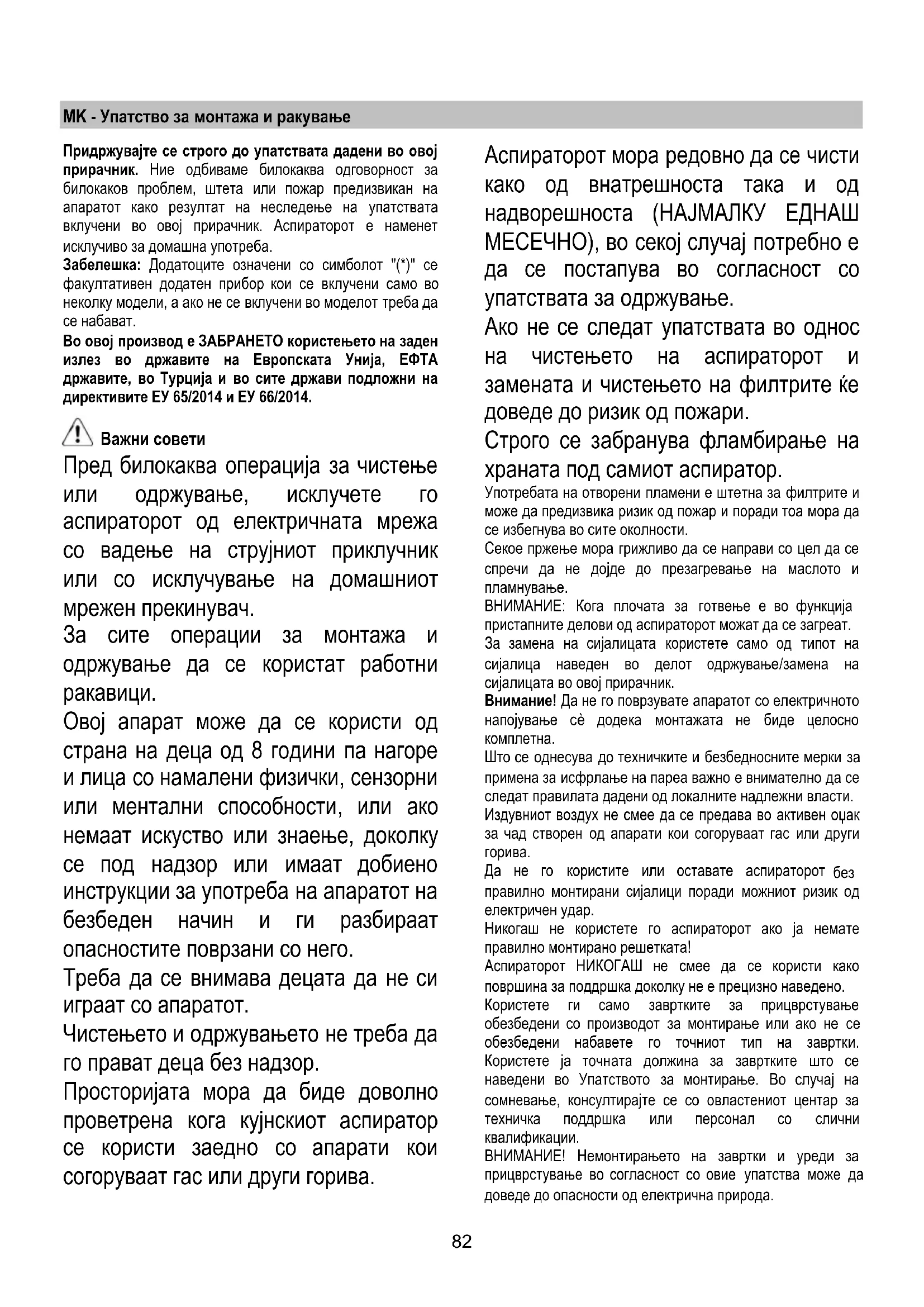 Овој апарат може да се користи од страна на деца од 8 години па нагоре и лица со намалени физички, сензорни или ментални способности, или ако немаат искуство или знаење, доколку се под надзор или имаат добиено инструкции за употреба на апаратот на безбеден начин и ги разбираат опасностите поврзани со него. Треба да се внимава децата да не си играат со апаратот. Чистењето и одржувањето не треба да го прават деца без надзор. Просторијата мора да биде доволно проветрена кога кујнскиот аспиратор се користи заедно со апарати кои согоруваат гас или други горива. Аспираторот мора редовно да се чисти како од внатрешноста така и од надворешноста (НАЈМАЛКУ ЕДНАШ МЕСЕЧНО), во секој случај потребно е да се постапува во согласност со упатствата за одржување. Ако не се следат упатствата во однос на чистењето на аспираторот и замената и чистењето на филтрите ќе доведе до ризик од пожари. Строго се забранува фламбирање на храната под самиот аспиратор. Употребата на отворени пламени е штетна за филтрите и може да предизвика ризик од пожар и поради тоа мора да се избегнува во сите околности. Секое пржење мора грижливо да се направи со цел да се спречи да не дојде до презагревање на маслото и пламнување. ВНИМАНИЕ: Кога плочата за готвење е во функција пристапните делови од аспираторот можат да се загреат. За замена на сијалицата користете само од типот на сијалица наведен во делот одржување/замена на сијалицата во овој прирачник. Внимание! Да не го поврзувате апаратот со електричното напојување сè додека монтажата не биде целосно