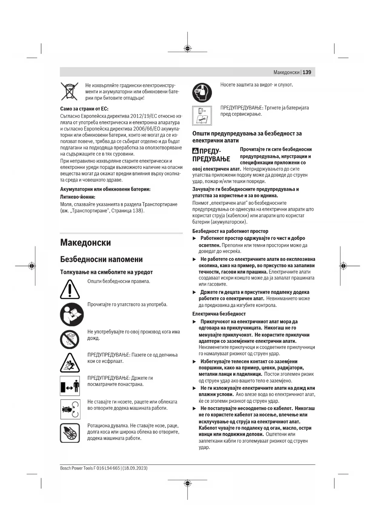 Употреба и чување на батериски алат u Полнете ја батеријата само со полнач наведен од производителот. Полнач којшто е соодветен за еден тип сет на батерии може да предизвика опасност од пожар ако се користи за друг сет на батерии. u Електричните алати користете ги само со специјално наменети сетови на батерии. Користењето на други сетови на батерии може да предизвика опасност од повреда или пожар. u Кога не го користите сетот на батерии, чувајте го подалеку од други метални предмети, како на пр., спојувалки, монети, клучеви, шајки, завртки или други помали метални предмети што може да предизвикаат спој од еден до друг извор. Краток F 016 L94 665 | (18.09.2023) Bosch Power ToolsМакедонски | 141 спој на батериските извори може да предизвика изгореници или пожар. u Под непредвидени околности, течноста може да истече од батеријата; избегнувајте контакт. При случаен допир, измијте се со млаз вода. Ако течноста влезе во очите, побарајте дополнителна медицинска помош. Течност истечена од батеријата може да предизвика иритација или изгореници. u Не употребувајте сет на батерии или алат што е оштетен или изменет. Оштетени или изменети батерии може да реагираат непредвидливо и да предизвикаат пожар, експлозија или опасност од