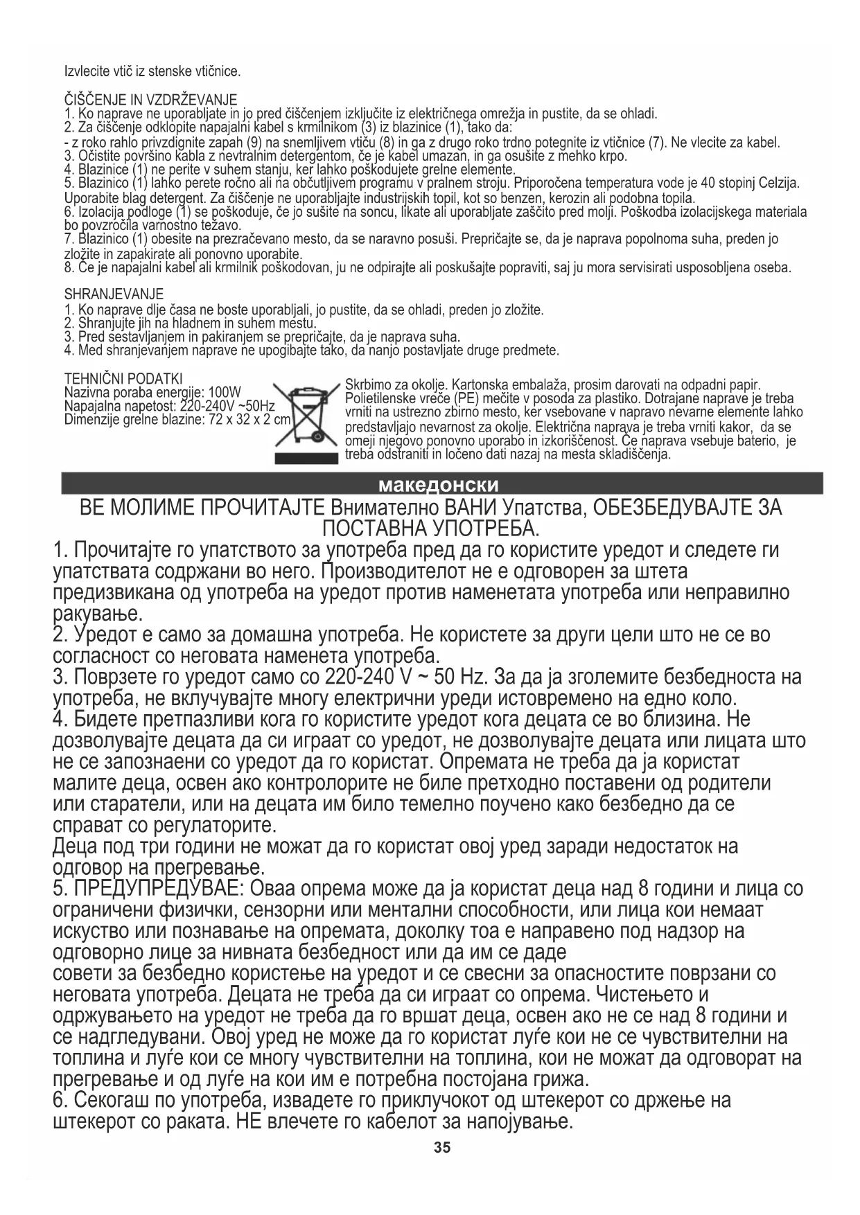 rezidualnu struju (RCD), nazivna zaostala struja koja ne prelazi 30 mA. S tim u vezi obratite se električaru. Се грижиме за природната средина. Картонските паковки молиме да се наменат за рециклирање. Полиетиленовите кеси (PE) да се фрлат во контењер за пластика. Искористениот уред треба да се предаде во соодветниот складирачки пункт, бидејќи небезбедните состојки кои се наоѓаат во уредот можат да бидат загрозување за средината. Електричниот уред треба да се предаде на начин кој ќе оневозможи негова повторна употреба и искористување. Доколку во уредот има батерии, треба да се извадат и посебно да се предадат во складирачкиот пункт. ТЕХНИЧКИ ПОДАТОЦИ Номинална потрошувачка на енергија: 100W Напон на напојување: 220-240V ~50Hz Димензии на грејната рампа: 72 x 32 x 2cm39
