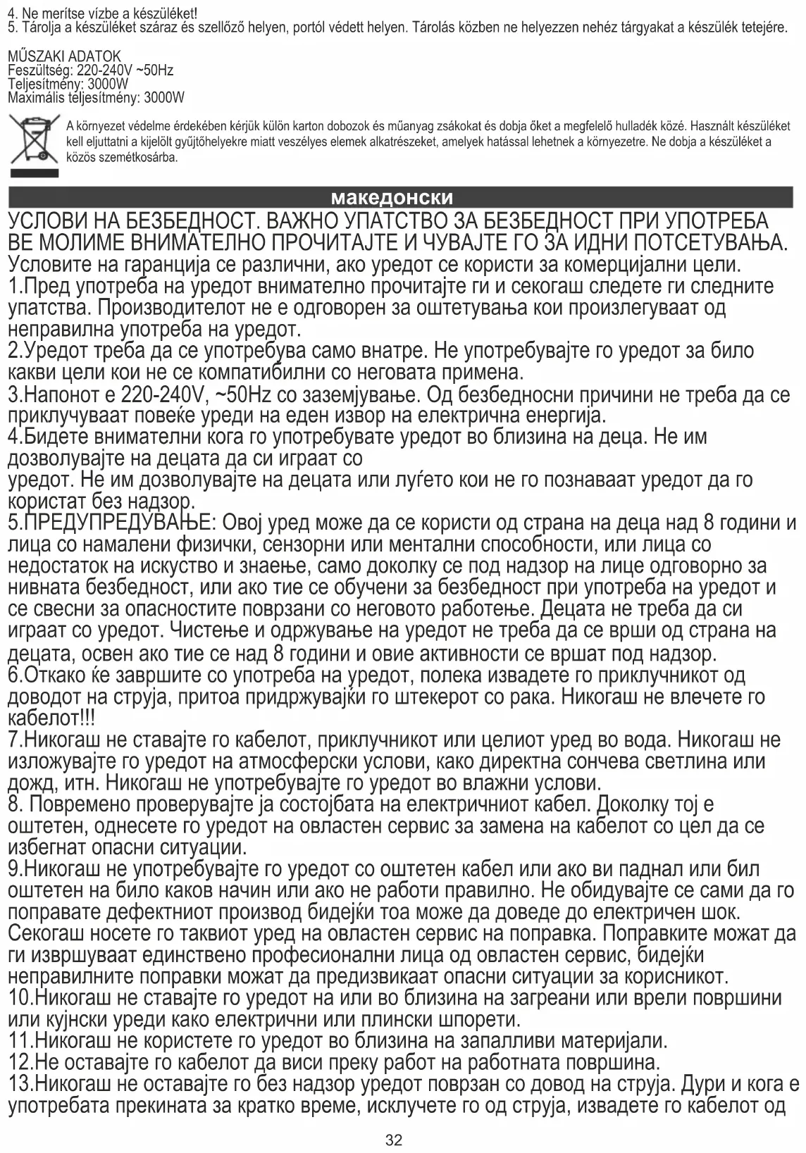 5. Чувајте го уредот на суво и проветрено место заштитено од прашина. Не ставајте тешки предмети на горниот дел од уредот за време на складирањето. ТЕХНИЧКИ ПОДАТОЦИ Напон: 220-240V ~50Hz Моќност: 3000 W Максимална моќност: 3000 W Се грижиме за природната средина. Картонските паковки молиме да се наменат за рециклирање. Полиетиленовите кеси (PE) да се фрлат во контењер за пластика. Искористениот уред треба да се предаде во соодветниот складирачки пункт, бидејќи небезбедните состојки кои се наоѓаат во уредот можат да бидат загрозување за средината. Електричниот уред треба да се предаде на начин кој ќе оневозможи негова повторна употреба и искористување. Доколку во уредот има батерии, треба да се извадат и посебно да се предадат во складирачкиот пункт.