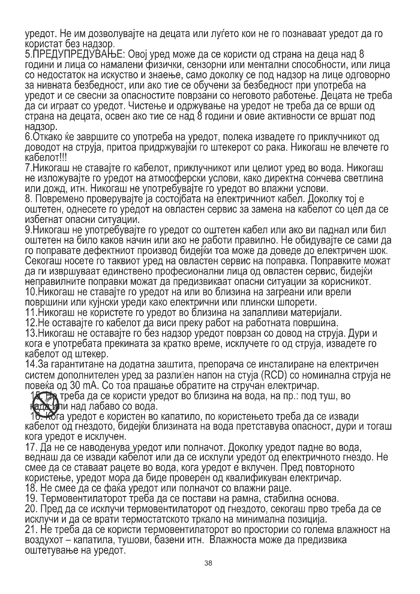 УСЛОВИ НА БЕЗБЕДНОСТ. ВАЖНО УПАТСТВО ЗА БЕЗБЕДНОСТ ПРИ УПОТРЕБА ВЕ МОЛИМЕ ВНИМАТЕЛНО ПРОЧИТАЈТЕ И ЧУВАЈТЕ ГО ЗА ИДНИ ПОТСЕТУВАЊА. Условите на гаранција се различни, ако уредот се користи за комерцијални цели. 1.Пред употреба на уредот внимателно прочитајте ги и секогаш следете ги следните упатства. Производителот не е одговорен за оштетувања кои произлегуваат од неправилна употреба на уредот. 2.Уредот треба да се употребува само внатре. Не употребувајте го уредот за било какви цели кои не се компатибилни со неговата примена. 3.Напонот е 220-240V, ~50Hz со заземјување. Од безбедносни причини не треба да се приклучуваат повеќе уреди на еден извор на електрична енергија. 4.Бидете внимателни кога го употребувате уредот во близина на деца. Не им дозволувајте на децата да си играат со38 уредот. Не им дозволувајте на децата или луѓето кои не го познаваат уредот да го користат без надзор. 5.ПРЕДУПРЕДУВАЊЕ: Овој уред може да се користи од страна на деца над 8 години и лица со намалени физички, сензорни или ментални способности, или лица со недостаток на искуство и знаење, само доколку се под надзор на лице одговорно за нивната безбедност, или ако тие се обучени за безбедност при употреба на уредот и се свесни за опасностите поврзани со неговото работење. Децата не треба да си играат со уредот. Чистење и одржување на уредот не треба да се врши од страна на децата, освен ако тие се над 8 години и овие активности се вршат под