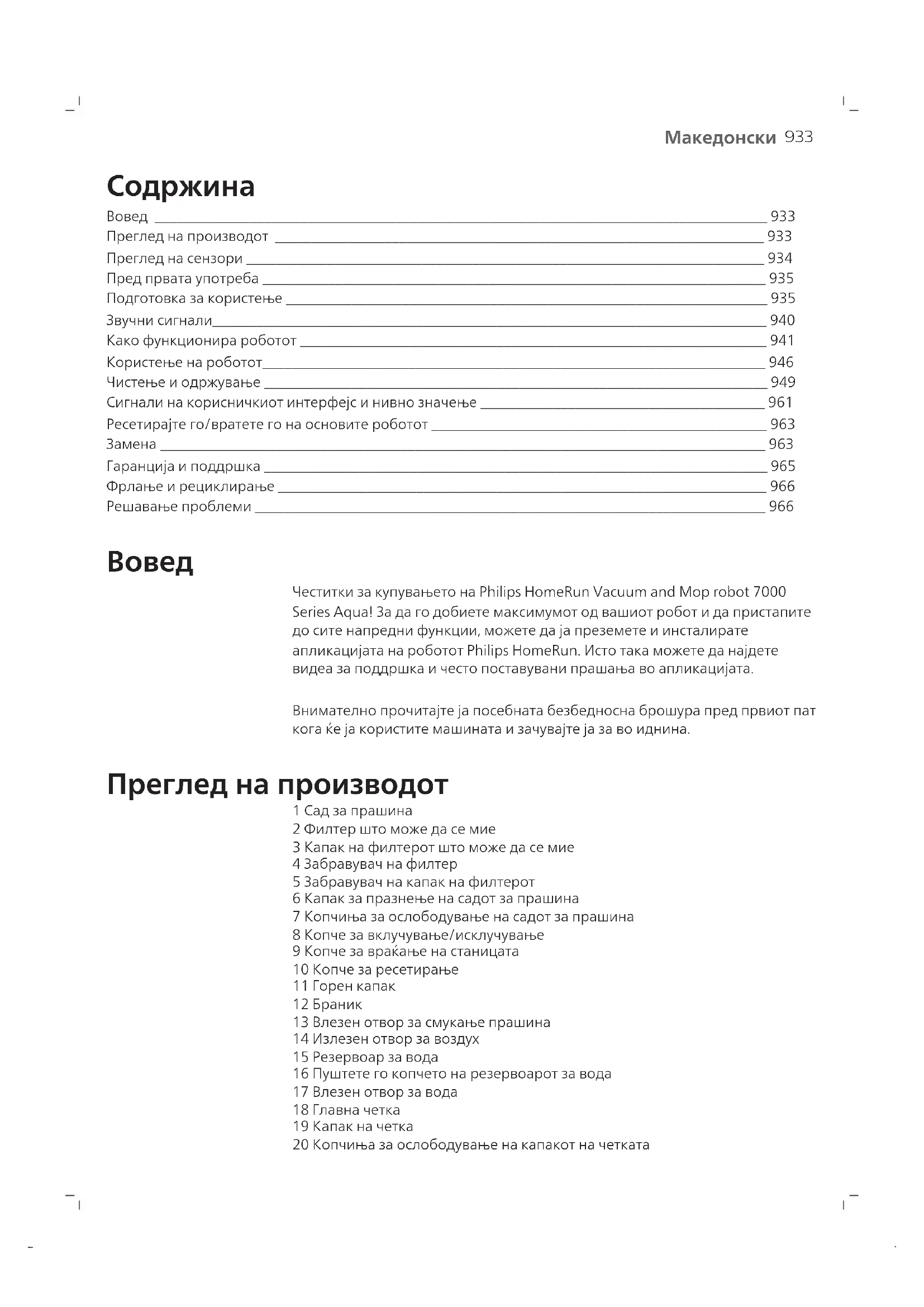 Честитки за купувањето на Philips HomeRun Vacuum and Mop robot 7000 Series Aqua! За да го добиете максимумот од вашиот робот и да пристапите до сите напредни функции, можете да ја преземете и инсталирате апликацијата на роботот Philips HomeRun. Исто така можете да најдете видеа за поддршка и често поставувани прашања во апликацијата. Внимателно прочитајте ја посебната безбедносна брошура пред првиот пат кога ќе ја користите машината и зачувајте ја за во иднина. Преглед на производот 1 Сад за прашина 2 Филтер што може да се мие 3 Капак на филтерот што може да се мие 4 Забравувач на филтер 5 Забравувач на капак на филтерот 6 Капак за празнење на садот за прашина 7 Копчиња за ослободување на садот за прашина 8 Копче за вклучување/исклучување 9 Копче за враќање на станицата 10 Копче за ресетирање 11 Горен капак 12 Браник 13 Влезен отвор за смукање прашина 14 Излезен отвор за воздух 15 Резервоар за вода 16 Пуштете го копчето на резервоарот за вода 17 Влезен отвор за вода 18 Главна четка 19 Капак на четка 20 Копчиња за ослободување на капакот на четката934