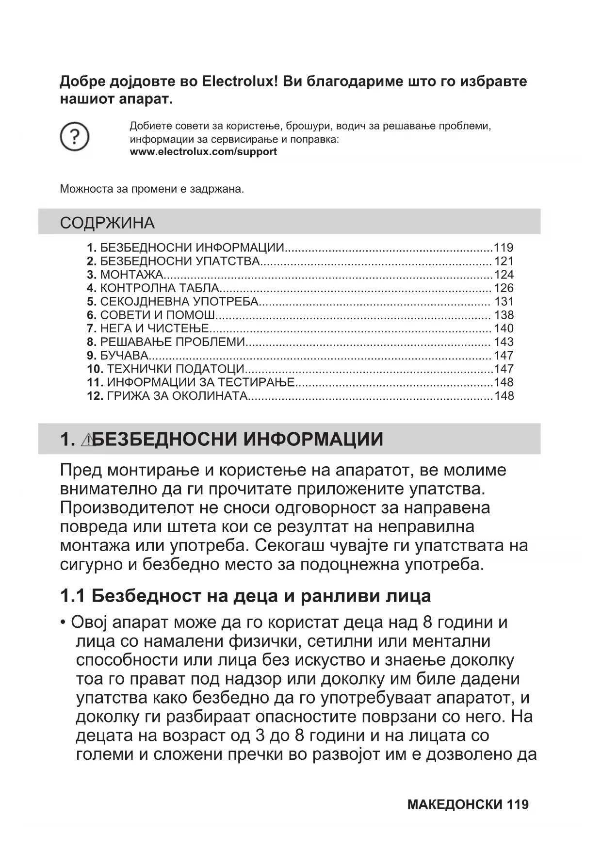 Рециклирајте ги материјалите со симболот . Ставете ја амбалажата во соодветни контејнери за да ја рециклирате. Помогнете во заштитата на живтната средина и човековото здравје и рециклирајте го отпадот од електрични и електронски апарати. Не фрлајте ги апаратите озанчени со симболот во отпадот од домаќинството. Вратете го производот во вашиот локален капацитет за рециклирање или контактирајте ја вашата општинска канцеларија. 148 МАКЕДОНСКИLe damos la bienvenida a Electrolux. Gracias por elegir nuestro aparato. Obtener consejos, folletos, soluciones a problemas e información de servicio yreparación:www.electrolux.com/supportSalvo modificaciones. CONTENIDO 1. INFORMACIÓN SOBRE SEGURIDAD.......................................................1492. INSTRUCCIONES DE SEGURIDAD.......................................................... 151