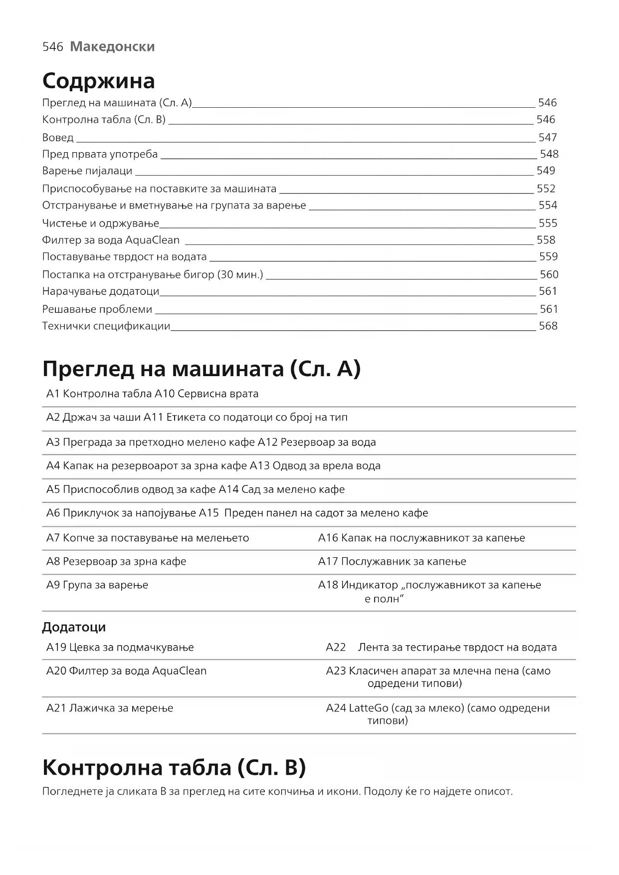 Преглед на машината (Сл. А)______________________________________________________________ 546 Контролна табла (Сл. B) __________________________________________________________________ 546 Вовед ___________________________________________________________________________________ 547 Пред првата употреба ____________________________________________________________________ 548 Варење пијалаци ________________________________________________________________________ 549 Приспособување на поставките за машината ______________________________________________ 552 Отстранување и вметнување на групата за варење _________________________________________ 554 Чистење и одржување____________________________________________________________________ 555 Филтер за вода AquaClean _______________________________________________________________ 558 Поставување тврдост на водата ___________________________________________________________ 559 Постапка на отстранување бигор (30 мин.) _________________________________________________ 560 Нарачување додатоци____________________________________________________________________ 561 Решавање проблеми _____________________________________________________________________ 561 Технички спецификации__________________________________________________________________ 568 Преглед на машината (Сл. А) A1 Контролна табла A10 Сервисна врата A2 Држач за чаши A11 Етикета со податоци со број на тип A3 Преграда за претходно мелено кафе A12 Резервоар за вода A4 Капак на резервоарот за зрна кафе A13 Одвод за врела вода A5 Приспособлив одвод за кафе A14 Сад за мелено кафе A6 Приклучок за напојување A15 Преден панел на садот за мелено кафе A7 Копче за поставување на мелењето A16 Капак на послужавникот за капење A8 Резервоар за зрна кафе A17 Послужавник за капење A9 Група за варење A18 Индикатор „послужавникот за капење
