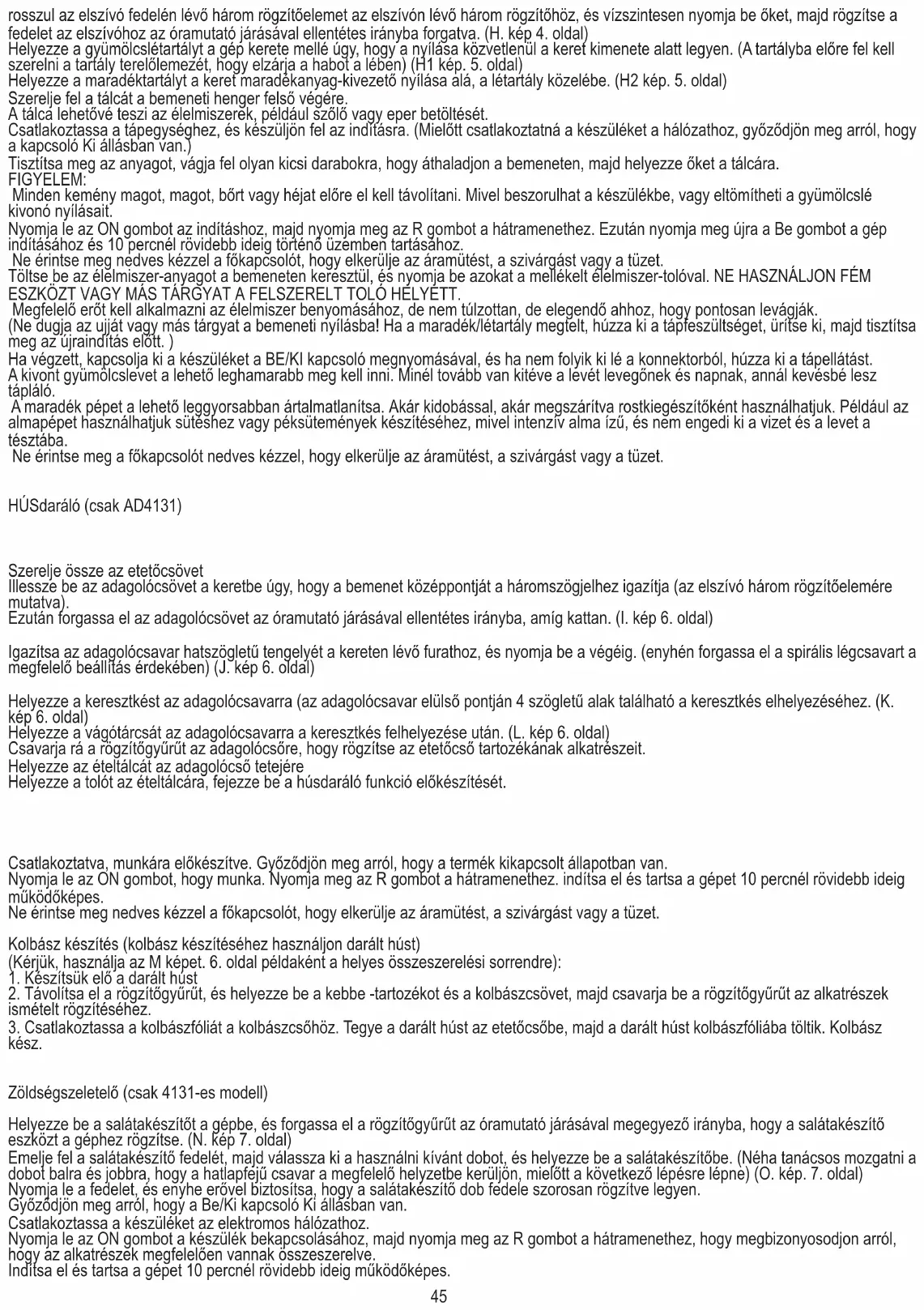 Преостанатата пулпа треба да се отстрани што е можно побрзо. Или со фрлање или може да се исуши и да се користи како додаток на влакна. На пример, пулпата од јаболко може да се користи за печење или правење колачи бидејќи има интензивен вкус на јаболка и нема да испушта вода и сокови во тестото. Не допирајте го прекинувачот за напојување со влажни раце за да избегнете струен удар, истекување или пожар. Мелница за месо (само AD4131) Составете ја цевката за хранење Вметнете ја цевката за напојување во рамката со порамнување на центарот на влезот со ознаката за триаголник (за да се насочи кон трите прицврстувачи на аспираторот). Потоа ротирајте ја цевката за напојување спротивно од стрелките на часовникот додека не кликне. (Слика I. Страна 6) Порамнете ја шестоаголната осовина на завртката за напојување со дупката во рамката и турнете ја до крај. (малку завртете го спиралниот пропелер за да направите добро усогласување) (Слика Ј. страница 6) Ставете го вкрстениот нож на завртката за напојување (има форма со 4 агли на предната точка на завртката за напојување за да го поставите вкрстениот нож. (Слика К. Страна 6)49 Ставете го дискот за сечење на завртката за напојување откако ќе го ставите вкрстениот нож. (Слика L. Страна 6) Зашрафете го прицврстувачкиот прстен на цевката за напојување за да ги прицврстите деловите од додатокот за цевката за напојување. Ставете го садот за храна на врвот на цевката за хранење Ставете го туркачот на садот за храна, завршете ја подготовката на функцијата за мелница за месо. Приклучен во струја, подгответе се за работа. Проверете дали производот е во режим на исклучување. Притиснете го копчето ON за да работа.притиснете го копчето R за рикверц. стартувајте и одржувајте ја машината да работи помалку од 10 минути. Не допирајте го прекинувачот за напојување со влажна рака за да избегнете електричен удар, истекување или пожар. Подготовка на колбас (користете мелено месо за да направите колбас) (Ве молиме користете ја сликата М. Страна 6 како пример за правилен редослед на склопување):