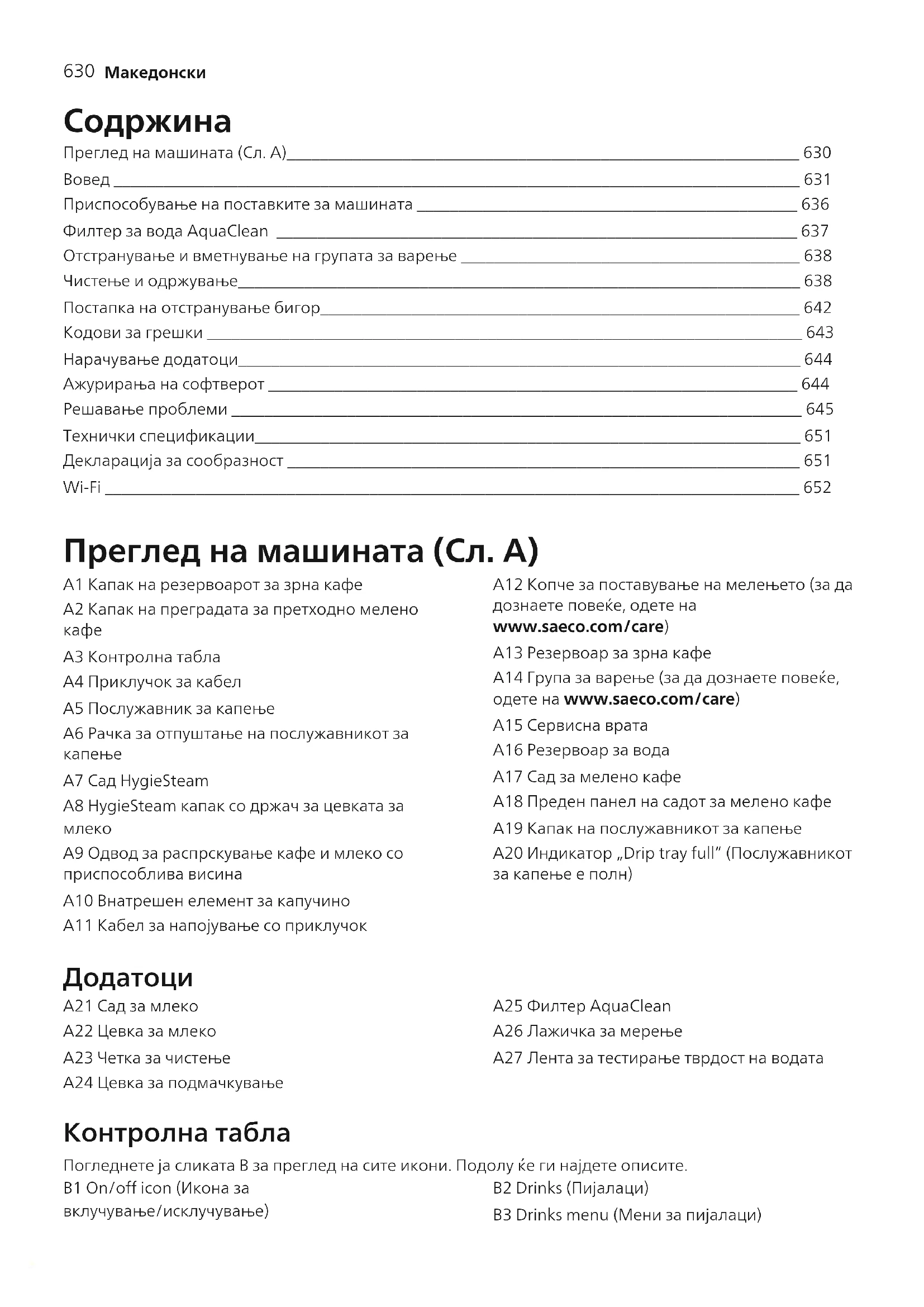 Ви честитаме што купивте целосно автоматска машина за кафе Saeco! За да имате целосна корист од мрежната поддршка што ја нуди Saeco, може да ја користите контролната табла за да ја регистрирате вашата машина преку вградената Wi-Fi врска или да одите на www.saeco.com/MyCoffeeMachine и да го регистрирате го производот таму. Внимателно прочитајте ја посебната безбедносна брошура пред првиот пат кога ќе ја користите машината и зачувајте ја за во иднина. Вашата целосно автоматска машина за кафе Saeco ви овозможува да се поврзете со Wi-Fi мрежата за подобро уживање на кафето. Со поврзување на вашата машина со Wi-Fi мрежата, ќе можете: