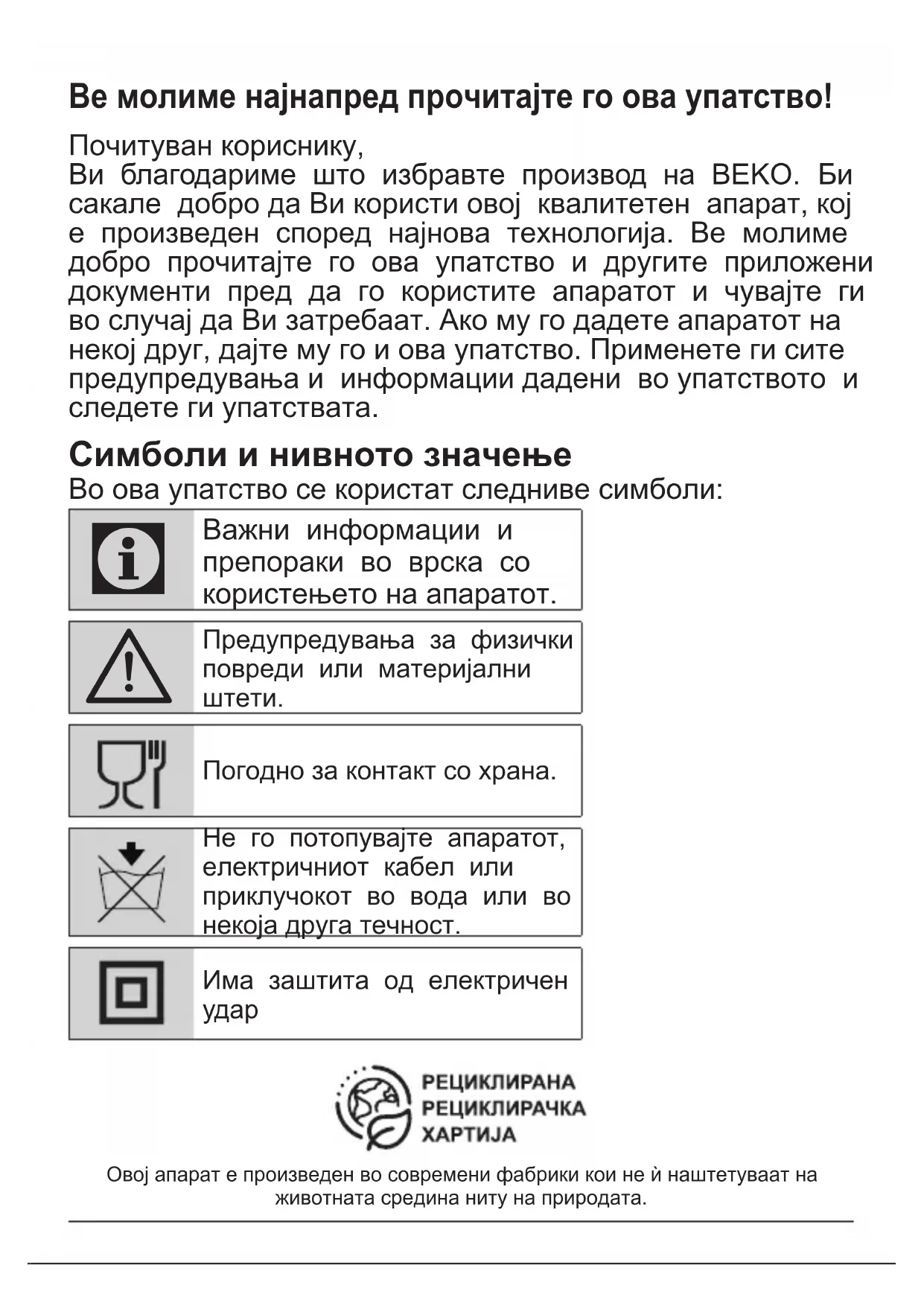 - Nëse pajisja bie, pajisja mund të mos funksionojë ose mund të ndodhë dëmtim i përhershëm.Ве молиме најнапред прочитајте го ова упатство! Почитуван кориснику, Ви благодариме што избравте производ на BEKO. Би сакале добро да Ви користи овој квалитетен апарат, кој е произведен според најнова технологија. Ве молиме добро прочитајте го ова упатство и другите приложени документи пред да го користите апаратот и чувајте ги во случај да Ви затребаат. Ако му го дадете апаратот на некој друг, дајте му го и ова упатство. Применете ги сите предупредувања и информации дадени во упатството и следете ги упатствата. Симболи и нивното значење Во ова упатство се користат следниве симболи: