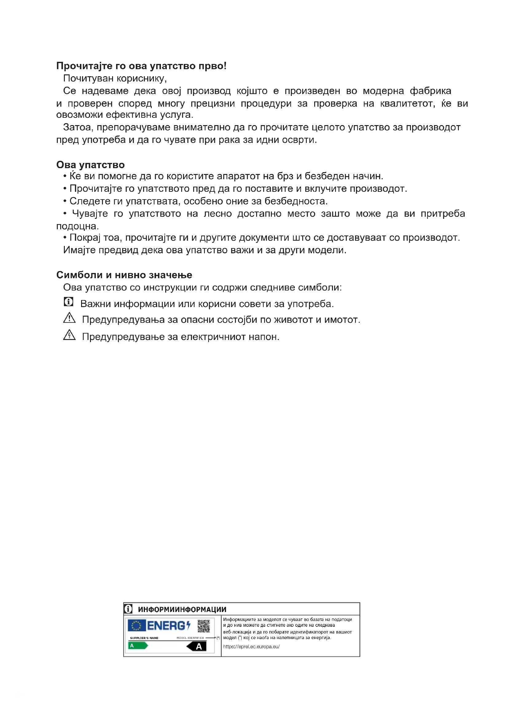 Информациите за моделот се чуваат во базата на податоци и до нив можете да стигнете ако одите на следнава веб-локација и да го побарате идентификаторот на вашиот модел (*) кој се наоѓа на налепницата за енергија. https://eprel.ec.europa.eu/