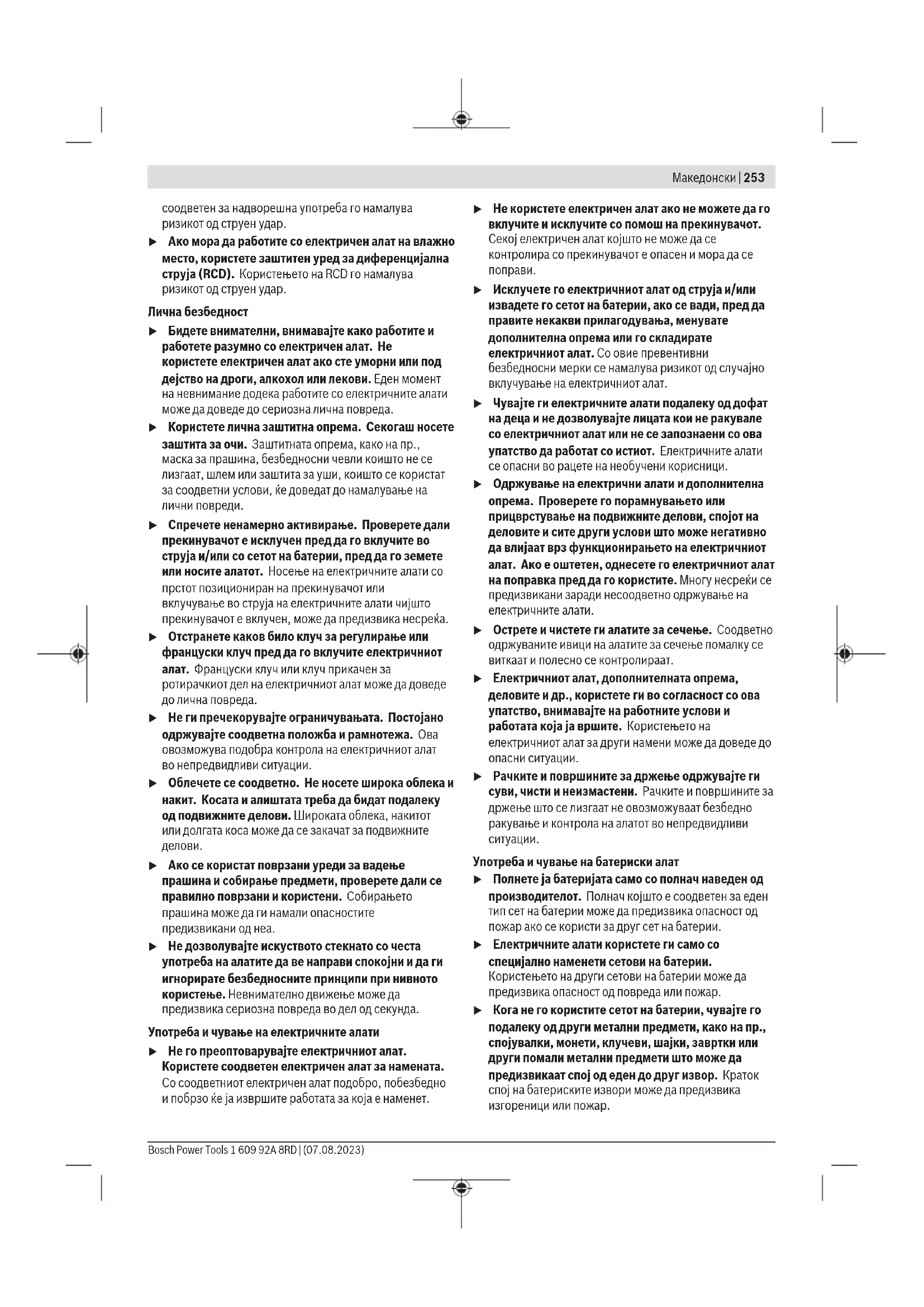 u При работа со електричен алат на отворено, користете продолжен кабел соодветен за надворешна употреба. Користењето на кабел 1 609 92A 8RD | (07.08.2023) Bosch Power ToolsМакедонски | 253 соодветен за надворешна употреба го намалува ризикот од струен удар. u Ако мора да работите со електричен алат на влажно место, користете заштитен уред за диференцијална струја (RCD). Користењето на RCD го намалува ризикот од струен удар. Лична безбедност u Бидете внимателни, внимавајте како работите и работете разумно со електричен алат. Не користете електричен алат ако сте уморни или под дејство на дроги, алкохол или лекови. Еден момент на невнимание додека работите со електричните алати може да доведе до сериозна лична повреда. u Користете лична заштитна опрема. Секогаш носете заштита за очи. Заштитната опрема, како на пр., маска за прашина, безбедносни чевли коишто не се лизгаат, шлем или заштита за уши, коишто се користат за соодветни услови, ќе доведат до намалување на лични повреди. u Спречете ненамерно активирање. Проверете дали прекинувачот е исклучен пред да го вклучите во струја и/или со сетот на батерии, пред да го земете или носите алатот. Носење на електричните алати со прстот позициониран на прекинувачот или вклучување во струја на електричните алати чијшто прекинувачот е вклучен, може да предизвика несреќа. u Отстранете каков било клуч за регулирање или француски клуч пред да го вклучите електричниот алат. Француски клуч или клуч прикачен за ротирачкиот дел на електричниот алат може да доведе до лична повреда. u Не ги пречекорувајте ограничувањата. Постојано одржувајте соодветна положба и рамнотежа. Ова овозможува подобра контрола на електричниот алат во непредвидливи ситуации. u Облечете се соодветно. Не носете широка облека и накит. Косата и алиштата треба да бидат подалеку од подвижните делови. Широката облека, накитот или долгата коса може да се закачат за подвижните