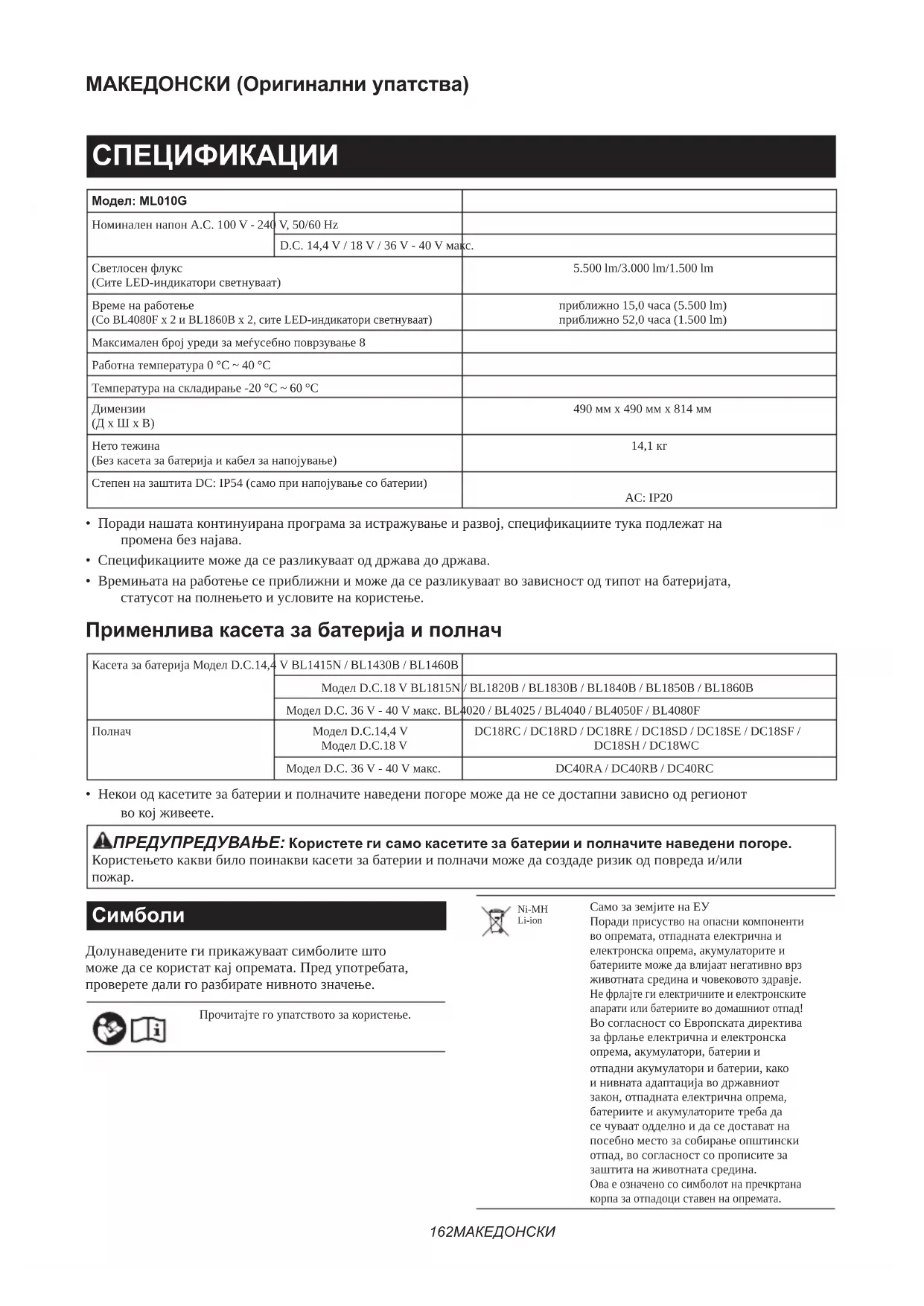 - Оригинална батерија и полнач на Makita НАПОМЕНА: Некои ставки на листата може да се вклучени со алатот како стандарден прибор. Тие може да се разликуваат од држава до држава.169 СРПСКИ СРПСКИ (Оригинално упутство) ТЕХНИЧКИ ПОДАЦИ Модел: ML010G Номинални напон AC 100 V – 240 V, 50/60 Hz DC 14,4 V / 18 V / 36 V – 40 V макс. Светлосни флукс (Светле све LED лампице)