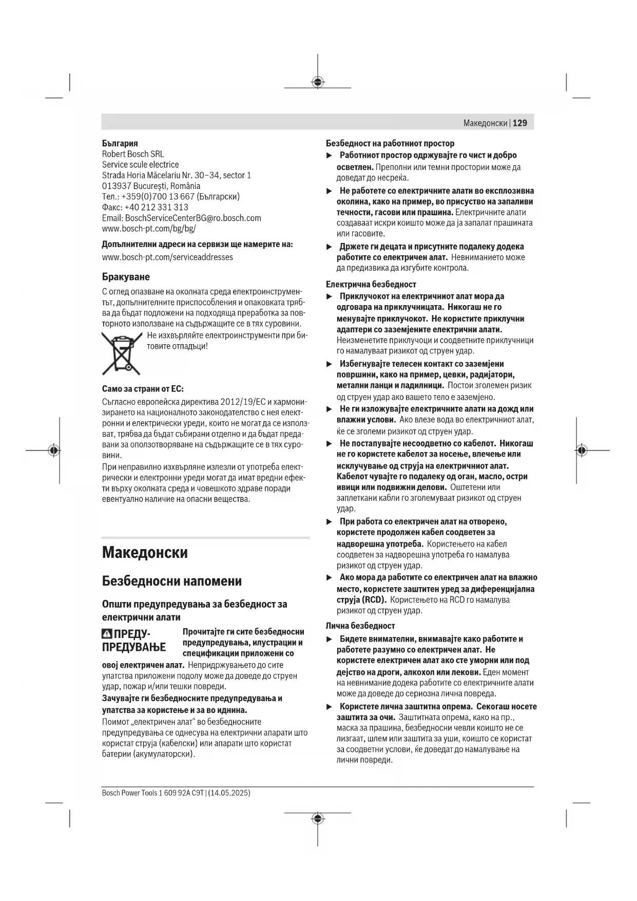 Bosch Power Tools 1 609 92A C9T | (14.05.2025)132 | Македонски Нивото на вибрации наведено во овие упатства и вредноста на емисијата на бучава се измерени според мерни постапки и можат да се користат за споредба меѓу електрични алати. Исто така може да се прилагоди за предвремена процена на нивото на вибрации и емисијата