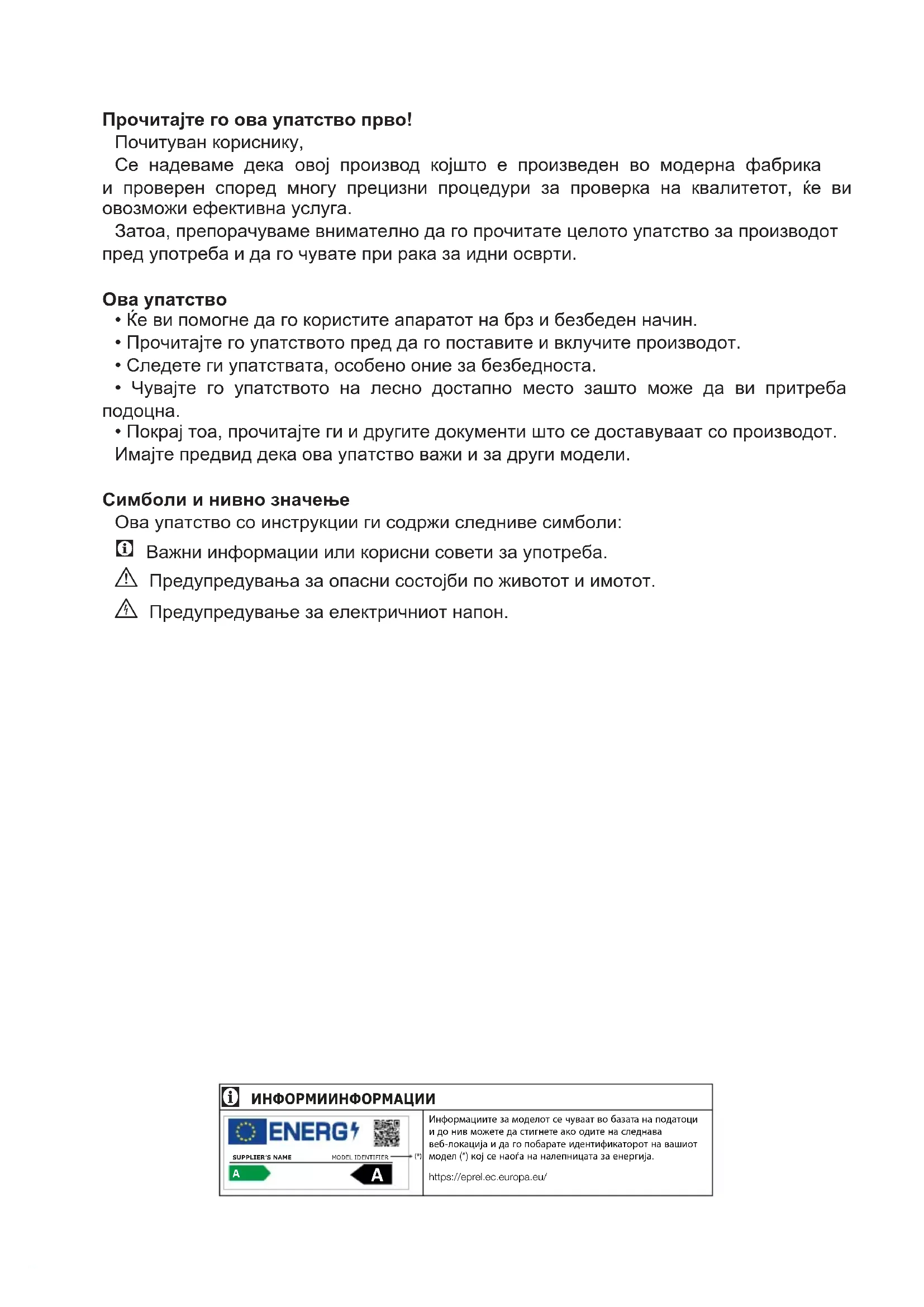 - Прочитајте го упатството пред да го поставите и вклучите производот.