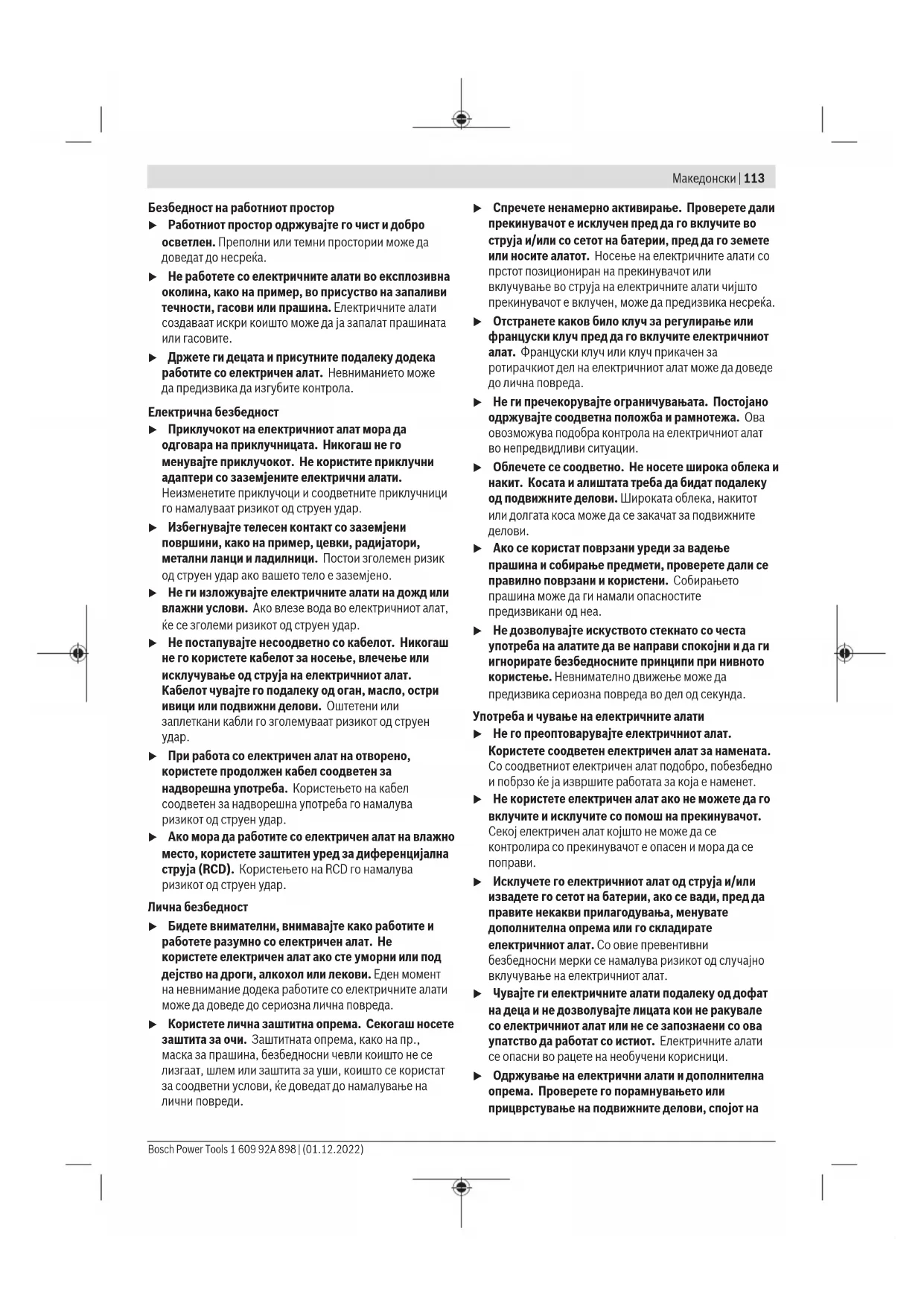 Прочитајте ги сите безбедносни предупредувања, илустрации и спецификации приложени со овој електричен алат. Непридржувањето до сите упатства приложени подолу може да доведе до струен удар, пожар и/или тешки повреди. Зачувајте ги безбедносните предупредувања и упатства за користење и за во иднина. Поимот „електричен алат“ во безбедносните предупредувања се однесува на електрични апарати што користат струја (кабелски) или апарати што користат батерии (акумулаторски). 1 609 92A 898 | (01.12.2022) Bosch Power ToolsМакедонски | 113 Безбедност на работниот простор u Работниот простор одржувајте го чист и добро осветлен. Преполни или темни простории може да доведат до несреќа. u Не работете со електричните алати во експлозивна околина, како на пример, во присуство на запаливи течности, гасови или прашина. Електричните алати создаваат искри коишто може да ја запалат прашината или гасовите. u Држете ги децата и присутните подалеку додека работите со електричен алат. Невниманието може да предизвика да изгубите контрола. Електрична безбедност u Приклучокот на електричниот алат мора да одговара на приклучницата. Никогаш не го менувајте приклучокот. Не користите приклучни адаптери со заземјените електрични алати. Неизменетите приклучоци и соодветните приклучници го намалуваат ризикот од струен удар. u Избегнувајте телесен контакт со заземјени површини, како на пример, цевки, радијатори, метални ланци и ладилници. Постои зголемен ризик од струен удар ако вашето тело е заземјено. u Не ги изложувајте електричните алати на дожд или влажни услови. Ако влезе вода во електричниот алат, ќе се зголеми ризикот од струен удар. u Не постапувајте несоодветно со кабелот. Никогаш не го користете кабелот за носење, влечење или исклучување од струја на електричниот алат. Кабелот чувајте го подалеку од оган, масло, остри ивици или подвижни делови. Оштетени или заплеткани кабли го зголемуваат ризикот од струен