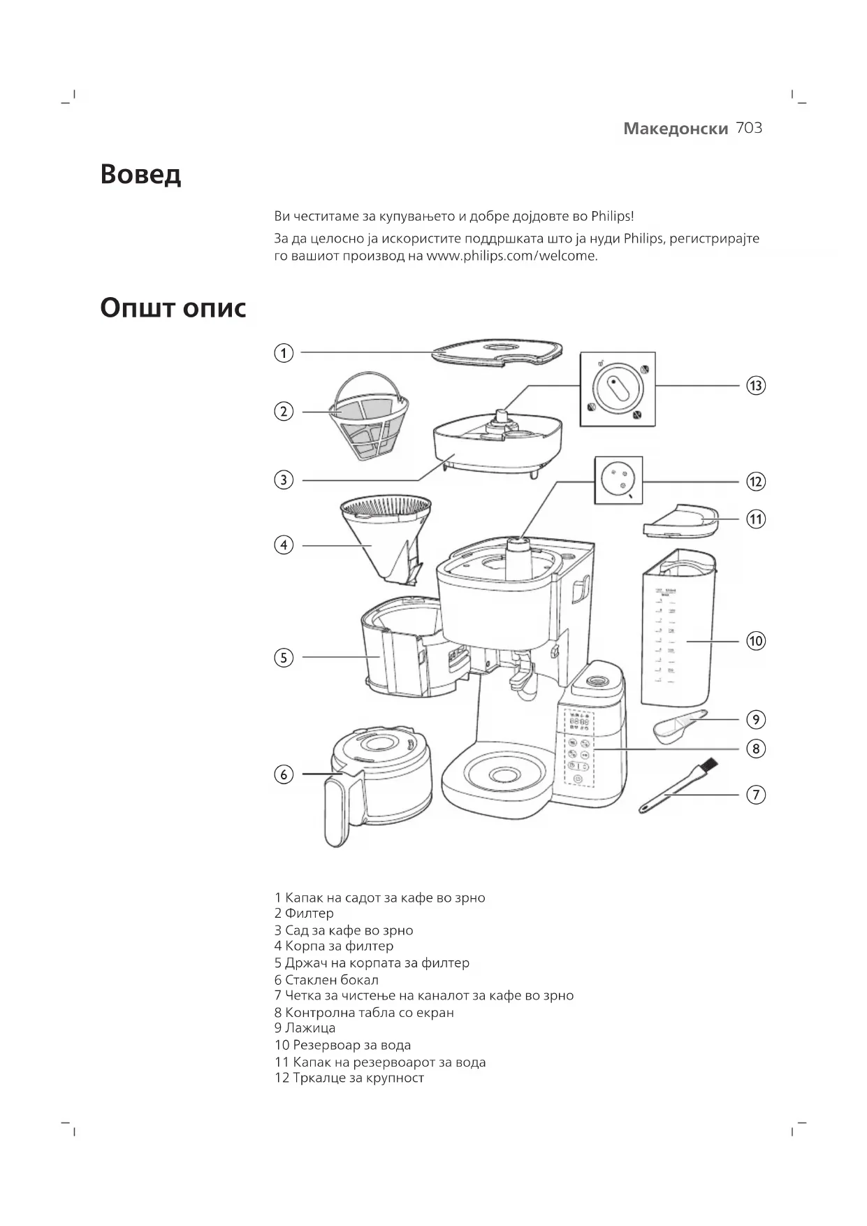 1 Капак на садот за кафе во зрно 2 Филтер 3 Сад за кафе во зрно 4 Корпа за филтер 5 Држач на корпата за филтер 6 Стаклен бокал 7 Четка за чистење на каналот за кафе во зрно 8 Контролна табла со екран 9 Лажица 10 Резервоар за вода 11 Капак на резервоарот за вода 12 Тркалце за крупност704