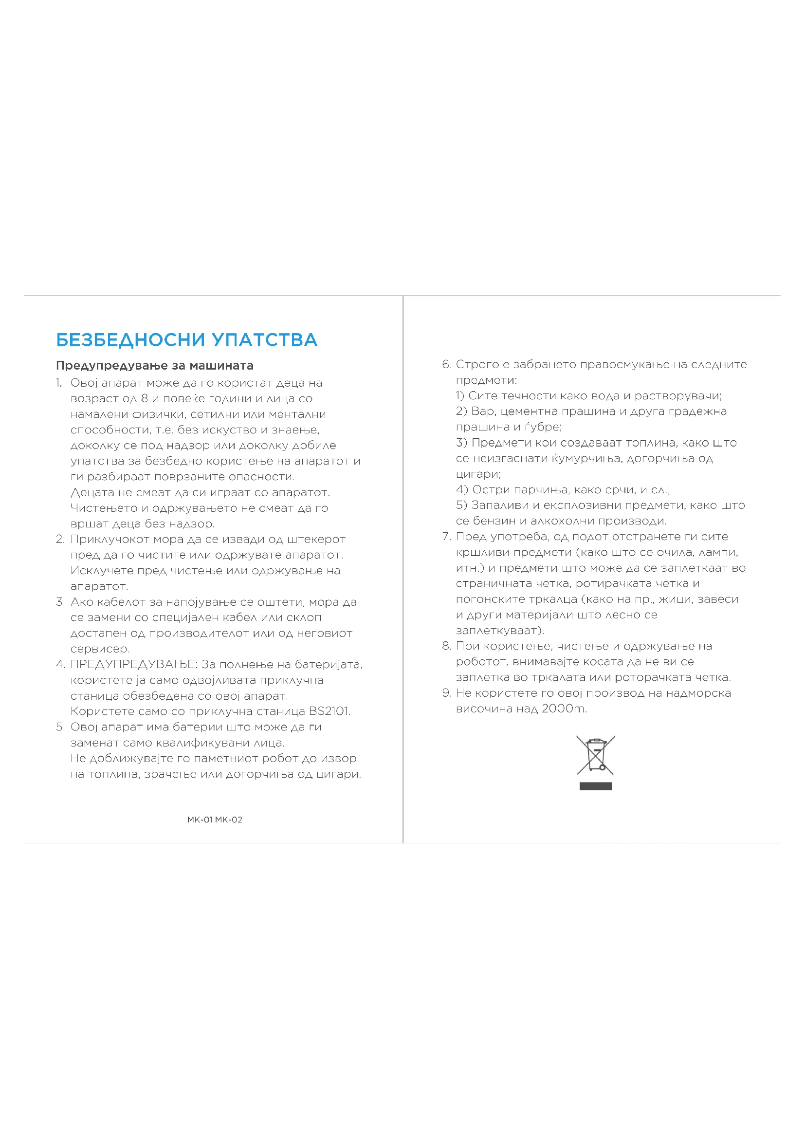 ПРЕДУПРЕДУВАЊЕ: За полнење на батеријата, користете ја само одвојливата приклучна станица обезбедена со овој апарат. Користете само со приклучна станица BS2101. Овој апарат има батерии што може да ги заменат само квалификувани лица. Не доближувајте го паметниот робот до извор на топлина, зрачење или догорчиња од цигари.