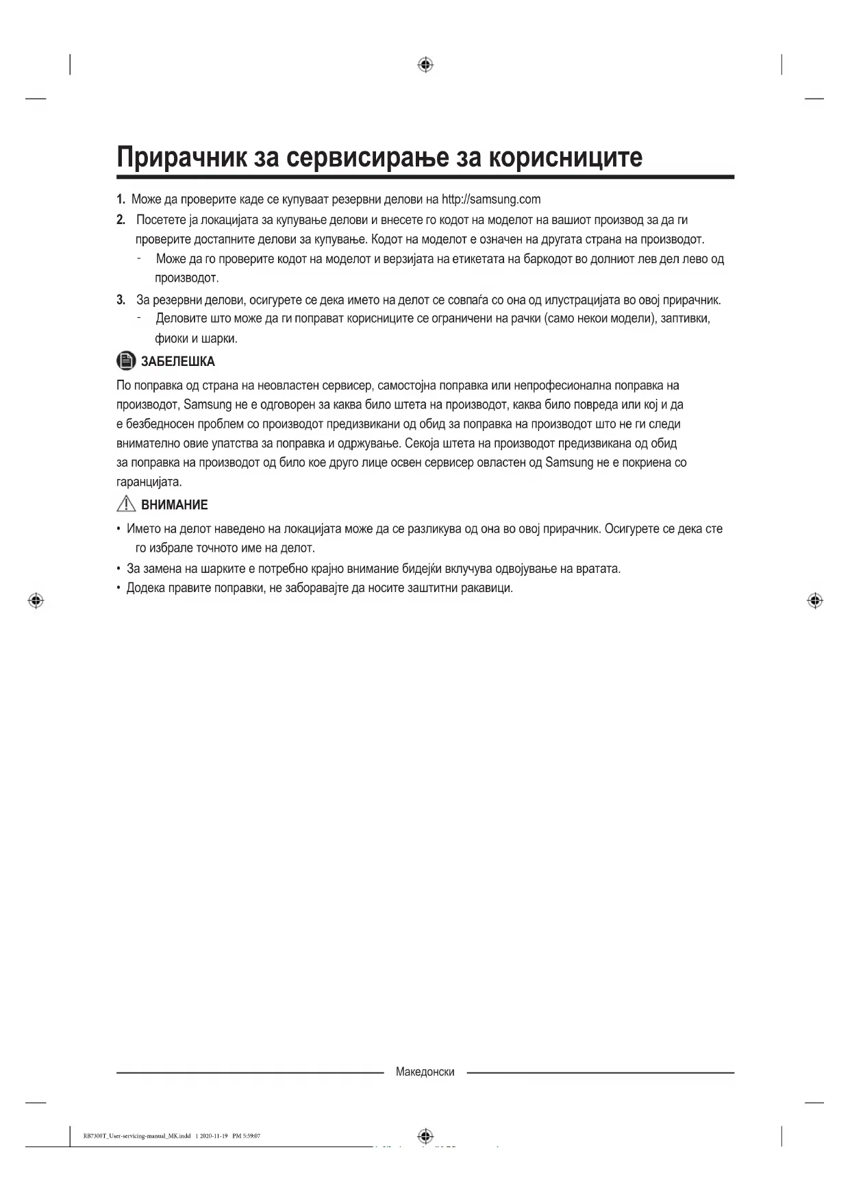 - Додека правите поправки, не заборавајте да носите заштитни ракавици. RB7300T_User-servicing-manual_MK.indd 1 2020-11-19 PM 5:59:07Македонски Фактичкиот изглед и обезбедените делови на фрижидерот може да се разликуваат, зависно од моделот и земјата.