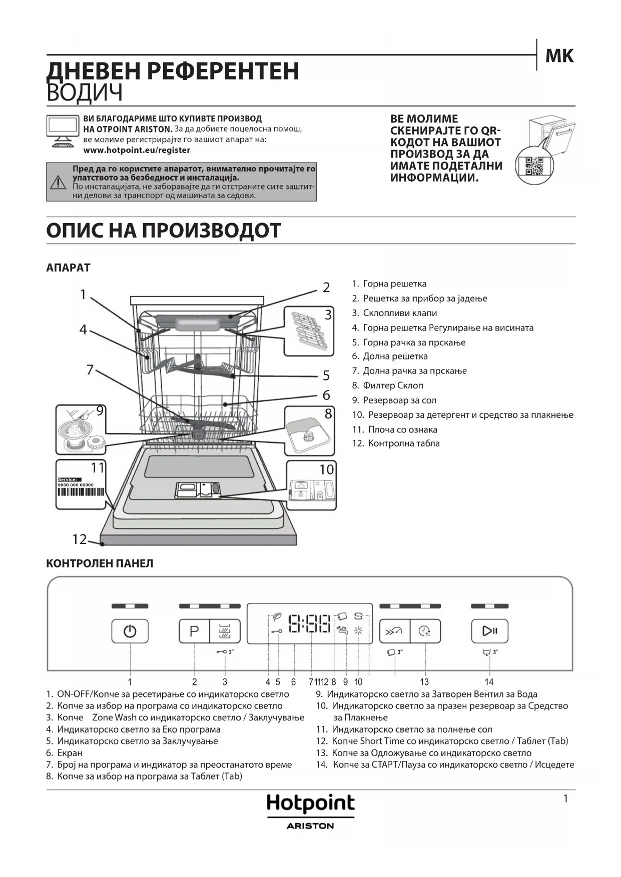 ВИ БЛАГОДАРИМЕ ШТО КУПИВТЕ ПРОИЗВОД НА OTPOINT ARISTON. За да добиете поцелосна помош, ве молиме регистрирајте го вашиот апарат на: www.hotpoint.eu/register1. Горна решетка 2. Решетка за прибор за јадење3. Склопливи клапи4. Горна решетка Регулирање на висината5. Горна рачка за прскање6. Долна решетка7. Долна рачка за прскање8. Филтер Склоп9. Резервоар за сол10. Резервоар за детергент и средство за плакнење11. Плоча со ознака12. Контролна табла ОПИС НА ПРОИЗВОДОТ