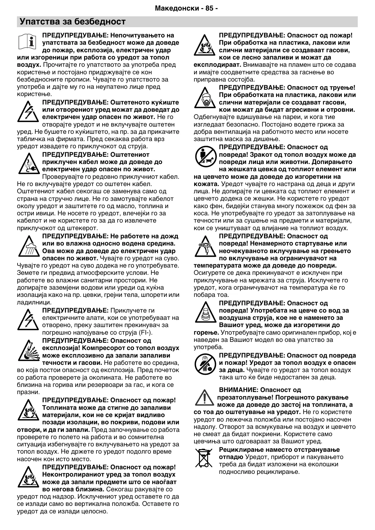 ПРЕДУПРЕДУВАЊЕ: Опасност од пожар! При обработка на пластика, лакови или слични материјали се создаваат гасови, кои се лесно запаливи и можат да експлодираат. Внимавајте на пламен што се содава и имајте соодветните средства за гаснење во приправна состојба. ПРЕДУПРЕДУВАЊЕ: Опасност од труење! При обработката на пластика, лакови или слични материјали се создават гасови, кои можат да бидат агресивни и отровни. Одбегнувајте вдишување на пареи, и кога тие изгледаат безопасно. Постојано водете грижа за добра вентилација на работното место или носете заштитна маска за дишење. ПРЕДУПРЕДУВАЊЕ: Опасност од повреда! Зракот од топол воздух може да повреди лица или животни. Допирањето на жешката цевка од топлиот елемент или на цевчето може да доведе до изгоретини на кожата. Уредот чувајте го настрана од деца и други лица. Не допирајте ги цевката од топлиот елемент и цевчето додека се жешки. Не користете го уредот како фен, бидејќи станува многу пожежок од фен за коса. Не употребувајте го уредот за затоплување на течности или за сушење на предмети и материјали, кои се уништуваат од влијание на топлиот воздух. ПРЕДУПРЕДУВАЊЕ: Опасност од повреда! Ненамерното стартување или неочекуваното вклучување на греењето по вклучување на ограничувачот на температурата може да доведе до повреди. Осигурете се дека прекинувачот е исклучен при приклучување на мрежата за струја. Исклучете го уредот, кога ограничувачот на температура ќе го побара тоа. ПРЕДУПРЕДУВАЊЕ: Опасност од повреда! Употребата на цевче со вод за воздушна струја, кое не е наменето за Вашиот уред, може да изгоретини до горење. Употребувајте само оригинален прибор, кој е наведен за Вашиот модел во ова упатство за употреба. ПРЕДУПРЕДУВАЊЕ: Опасност од повреда и пожар! Уредот за топол воздух е опасен за деца. Чувајте го уредот за топол воздух така што ќе биде недостапен за деца. ВНИМАНИЕ: Опасност од презатоплување! Погрешното ракување може да доведе до застој на топлината, а со тоа до оштетување на уредот. Не го користете уредот во лежечка положба или постојано насочен надолу. Отворот за всмукување на воздух и цевчето не смеат да бидат покриени. Користете само цевчиња што одговараат за Вашиот уред. Рециклирање наместо отстранување отпадю Уредот, приборот и пакувањето треба да бидат изложени на еколошки подносливо рециклирање.