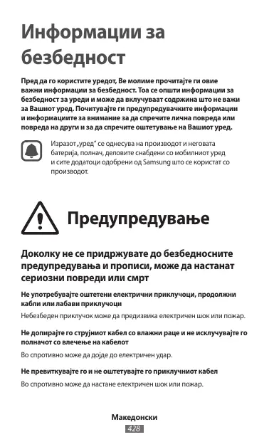 • Ne soumettez pas l’appareil à des températures extrêmes, car cela peut l’endommager ou réduire la capacité de chargement et la durée de vie de l’appareil et de la batterie. • Évitez que la batterie entrent en contact avec des objets métalliques, car cela risquerait de provoquer un court-circuit entre les bornes + et – de la batterie et de l’endommager de manière temporaire ou permanente. • N’utilisez jamais une batterie ou un chargeur endommagé(e). Ne conservez pas votre appareil à proximité ou à l’intérieur de radiateurs, de fours à micro-ondes, d’équipements de cuisine chauffants ou de conteneurs à haute pression • La batterie peut fuir. • Votre appareil peut surchauffer et causer un incendie. Cet appareil ne doit pas être utilisé ou stocké dans des zones où règne une forte concentration en poussières ou microparticules en suspension La poussière ou les microparticules peuvent provoquer des dysfonctionnements de l’appareil et entraîner des incendies ou des décharges électriques. Le connecteur à fonctions multiples et la fiche micro USB du chargeur ne doivent jamais entrer en contact avec des matériaux conducteurs, tels que liquides, poussière, poudres métalliques et mines de crayon Les matériaux conducteurs peuvent provoquer un court-circuit ou corroder les bornes et entraîner une explosion ou un incendie. Ne mordez et ne portez pas à la bouche l’appareil ou la batterie • Vous risquez d’endommager l’appareil ou de provoquer une explosion ou un incendie. • Surveillez les enfants ou les animaux qui pourraient s’étrangler avec des pièces de dimension réduite. • Assurez-vous que les enfants manipulent l’appareil de façon appropriée s’ils doivent l’utiliser.
