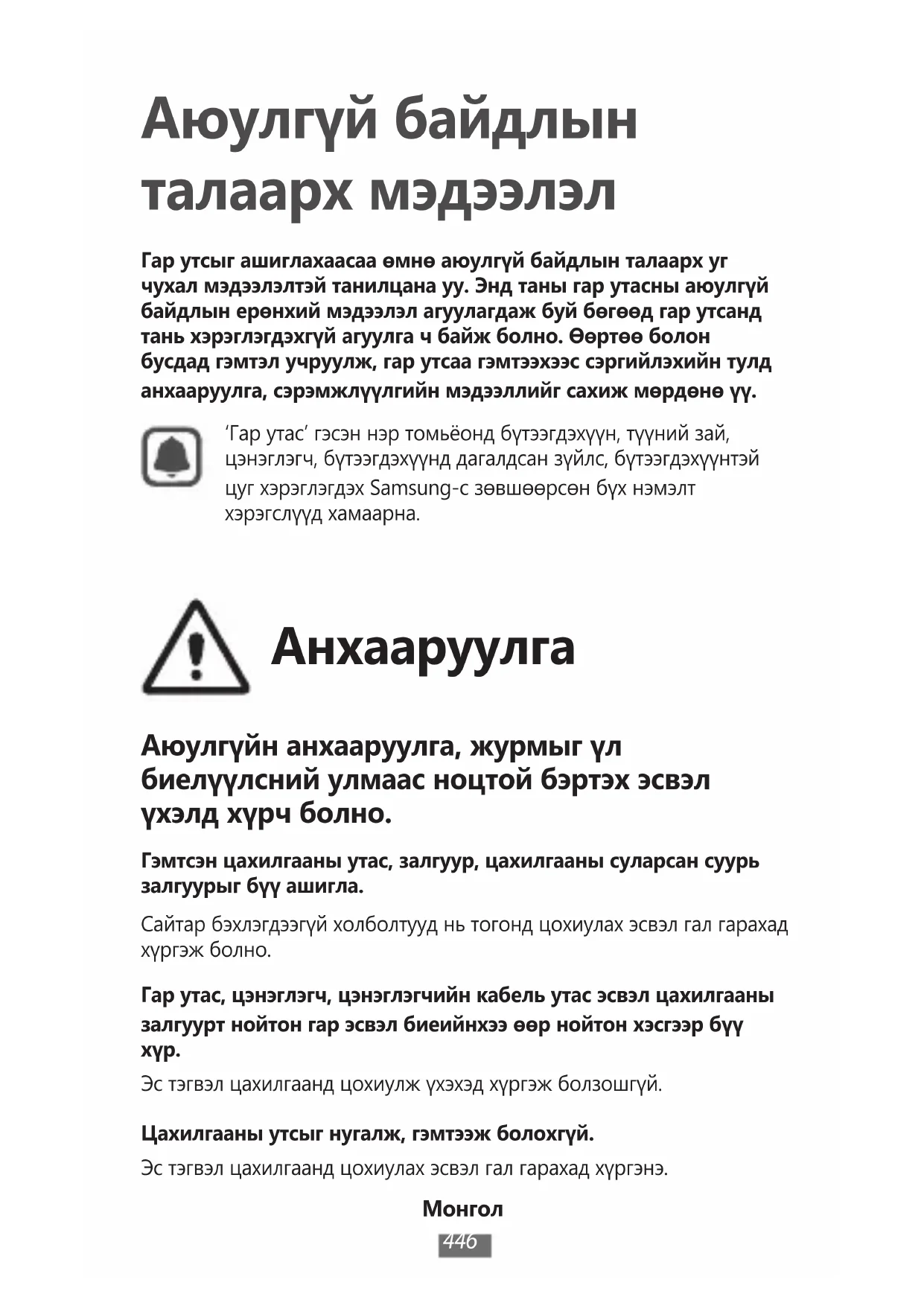Аюулгүй байдлын талаарх мэдээлэл Гар утсыг ашиглахаасаа өмнө аюулгүй байдлын талаарх уг чухал мэдээлэлтэй танилцана уу. Энд таны гар утасны аюулгүй байдлын ерөнхий мэдээлэл агуулагдаж буй бөгөөд гар утсанд тань хэрэглэгдэхгүй агуулга ч байж болно. Өөртөө болон бусдад гэмтэл учруулж, гар утсаа гэмтээхээс сэргийлэхийн тулд анхааруулга, сэрэмжлүүлгийн мэдээллийг сахиж мөрдөнө үү.‘Гар утас’ гэсэн нэр томьёонд бүтээгдэхүүн, түүний зай, цэнэглэгч, бүтээгдэхүүнд дагалдсан зүйлс, бүтээгдэхүүнтэй цуг хэрэглэгдэх Samsung-с зөвшөөрсөн бүх нэмэлт хэрэгслүүд хамаарна. Анхааруулга Аюулгүйн анхааруулга, журмыг үл биелүүлсний улмаас ноцтой бэртэх эсвэл үхэлд хүрч болно. Гэмтсэн цахилгааны утас, залгуур, цахилгааны суларсан суурь залгуурыг бүү ашигла.Сайтар бэхлэгдээгүй холболтууд нь тогонд цохиулах эсвэл гал гарахад хүргэж болно.Гар утас, цэнэглэгч, цэнэглэгчийн кабель утас эсвэл цахилгааны залгуурт нойтон гар эсвэл биеийнхээ өөр нойтон хэсгээр бүү Эс тэгвэл цахилгаанд цохиулж үхэхэд хүргэж болзошгүй.Цахилгааны утсыг нугалж, гэмтээж болохгүй.Эс тэгвэл цахилгаанд цохиулах эсвэл гал гарахад хүргэнэ.Монгол