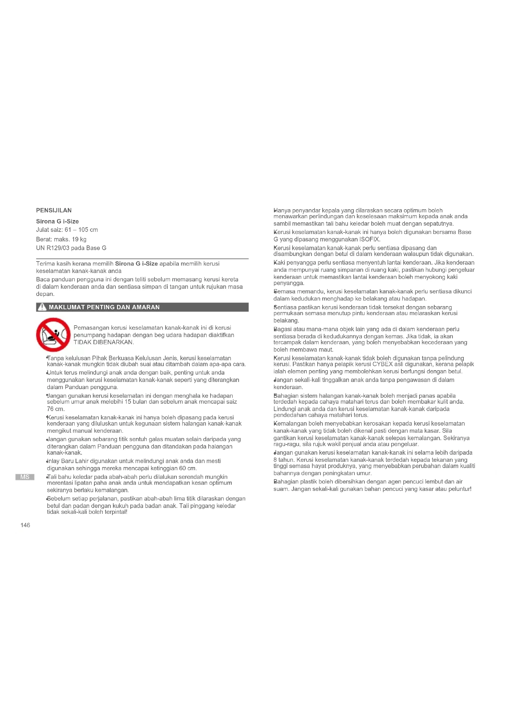 Ini ialah Sistem Halangan Kanak-Kanak Dipertingkatkan i-Size. Sistem ini diluluskan mengikut Peraturan UN No. R129/03 pada Base G, untuk penggunaan dalam kedudukan tempat duduk kenderaan serasi i-Size seperti yang dinyatakan oleh pengeluar kenderaan dalam panduan pengguna kenderaan mereka. Jika kenderaan anda tidak mempunyai kedudukan kerusi i-Size, sila lihat Senarai Jenis kenderaan. Anda boleh mendapatkan versi Senarai Jenis yang terkini daripada go.cybex-online.com/sirona-g-isize-car- compatibility. Semua kedudukan duduk dan rebah tidak dijamin boleh digunakan dalam semua kenderaan yang diluluskan.