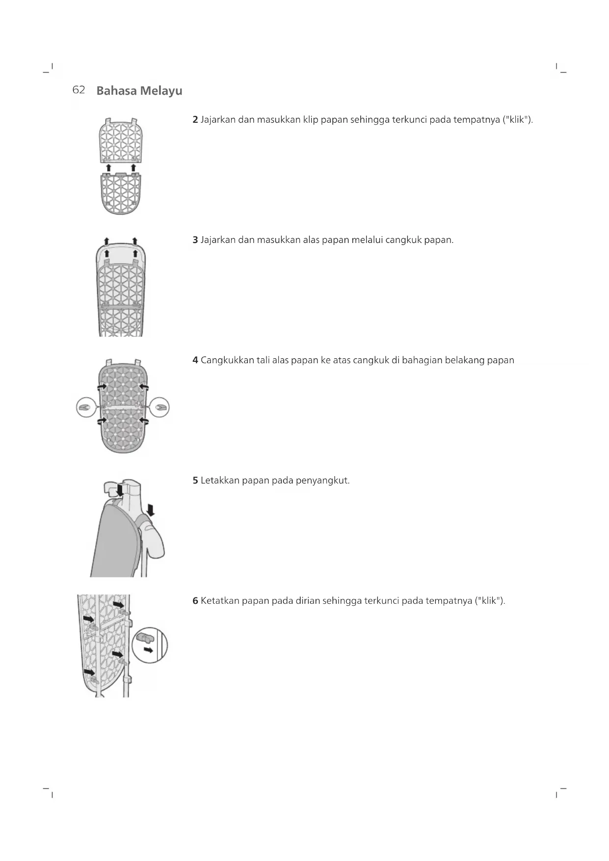4 Buka kunci klip kunci dirian yang tinggal, panjangkan dirian ke atas sepenuhnya dan kuncikanya. 5 Masukkan dok penstim ke dalam dirian sehingga terkunci pada tempatnya ("klik"). 6 Letakkan kepala penstim di atas dok penstim. Menyediakan papan 1 Catatkan bahagian-bahagian yang tersedia untuk perkakas yang anda beli.62 Bahasa Melayu 2 Jajarkan dan masukkan klip papan sehingga terkunci pada tempatnya ("klik"). 3 Jajarkan dan masukkan alas papan melalui cangkuk papan. 4 Cangkukkan tali alas papan ke atas cangkuk di bahagian belakang papan 5 Letakkan papan pada penyangkut. 6 Ketatkan papan pada dirian sehingga terkunci pada tempatnya ("klik").63 Bahasa Melayu 7 Anda boleh menggantung pakaian anda menggunakan penyangkut. 8 Anda boleh menggunakan penyangkut anda sendiri dan letakkannya di atas dok penstim. Menetapkan alas 1 Masukkan tali tengah melalui dok penstim. 2 Ketatkan 3 tali pada cangkuk di bahagian belakang penyangkut.64 Bahasa Melayu 3 Ketatkan alas pada dirian sehingga terkunci di tempatnya ("klik"). 4 Anda boleh menggantung pakaian anda menggunakan penyangkut. 5 Anda boleh menggunakan penyangkut anda sendiri dan letakkannya di atas dok penstim. Memasukkan berus