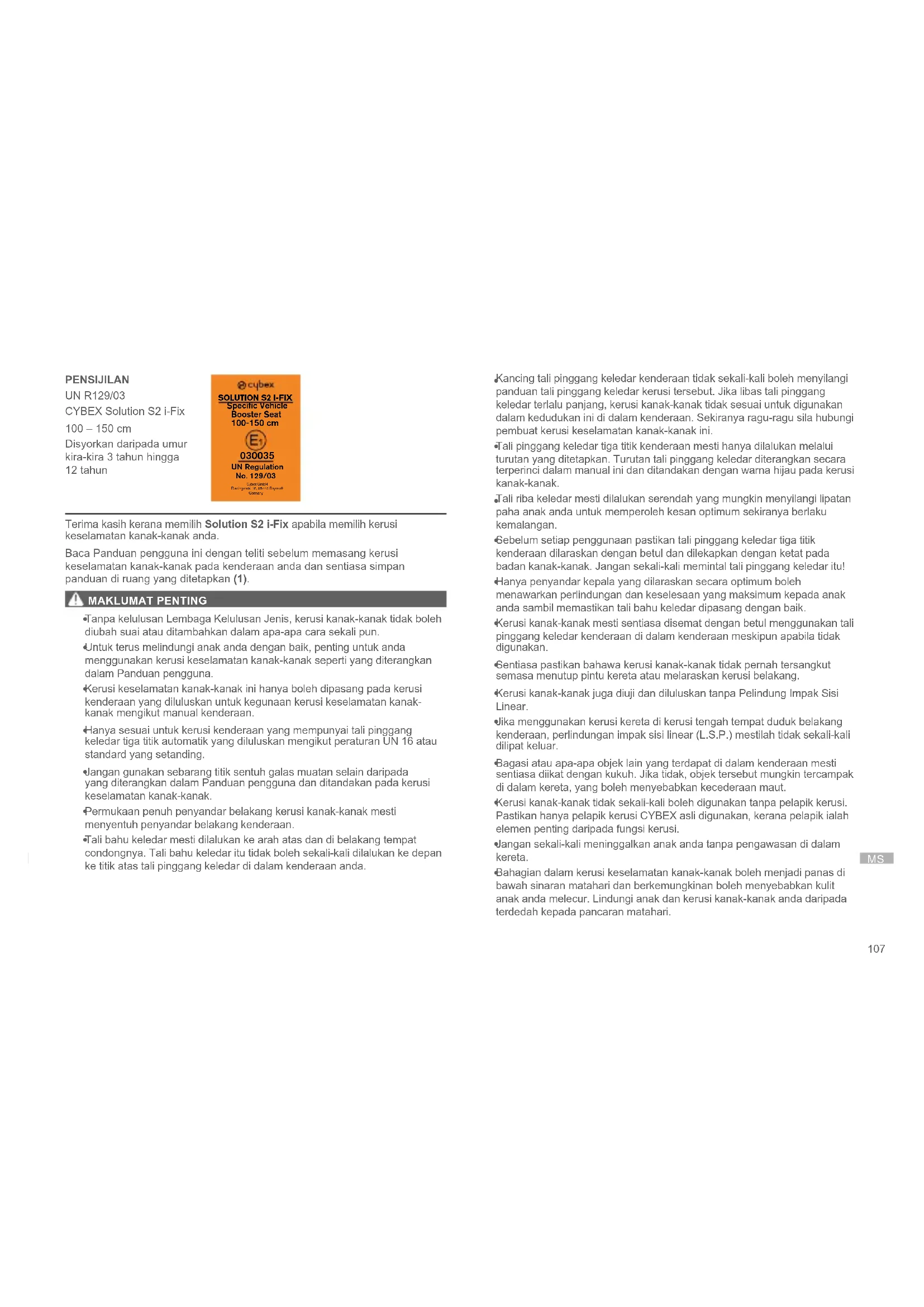 Kerusi kanak-kanak boleh digunakan pada kerusi kenderaan yang dilengkapi dengan tali pinggang tiga titik automatik. Sila rujuk senarai jenis kenderaan yang dilampirkan untuk kenderaan yang diluluskan. Anda boleh mendapatkan versi terkini daripada www.cybex-online.com. Sekiranya kereta anda tidak dilengkapi dengan titik penyambungan ISOFIX, terdapat kemungkinan untuk menggunakan SOLUTION S2 i-FIX dengan lengan penguncian ISOFIX yang tertarik balik. Apabila ketinggian kanak-kanak melebihi 135 cm, keserasian antara SOLUTION S2 i-FIX dan kenderaan anda mungkin berkurang. Sila semak senarai jenis kenderaan untuk memastikan jika kerusi kanak-kanak tersebut boleh digunakan dalam semua kedudukan penyandar kepala tanpa sekatan. Dalam keadaan yang luar biasa, kerusi kanak-kanak boleh juga digunakan pada kerusi penumpang depan. Sentiasa patuhi saranan pengilang kenderaan. MEMASANG KERUSI KANAK-KANAK DI DALAM KENDERAAN.