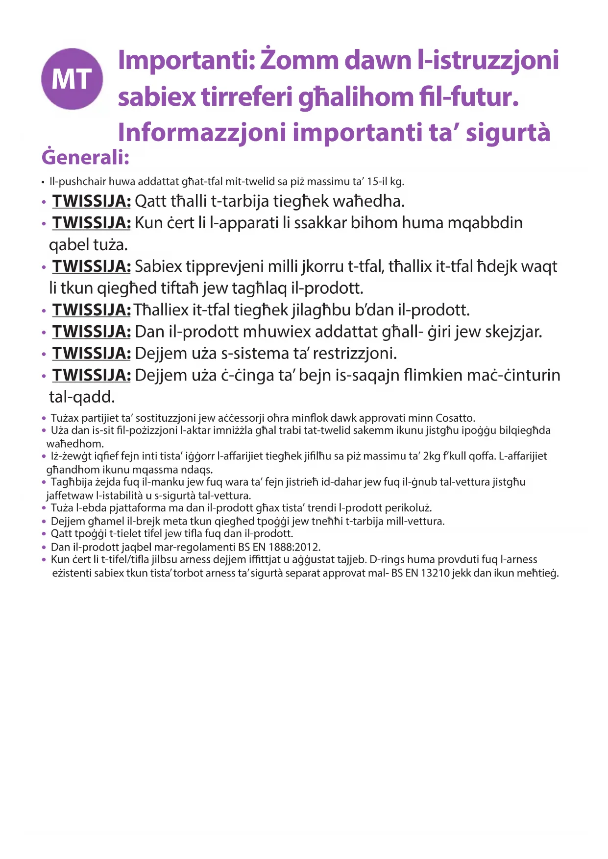 유모차MT Importanti: Żomm dawn l-istruzzjoni sabiex tirreferi għalihom l-futur. Informazzjoni importanti ta’ sigurtà