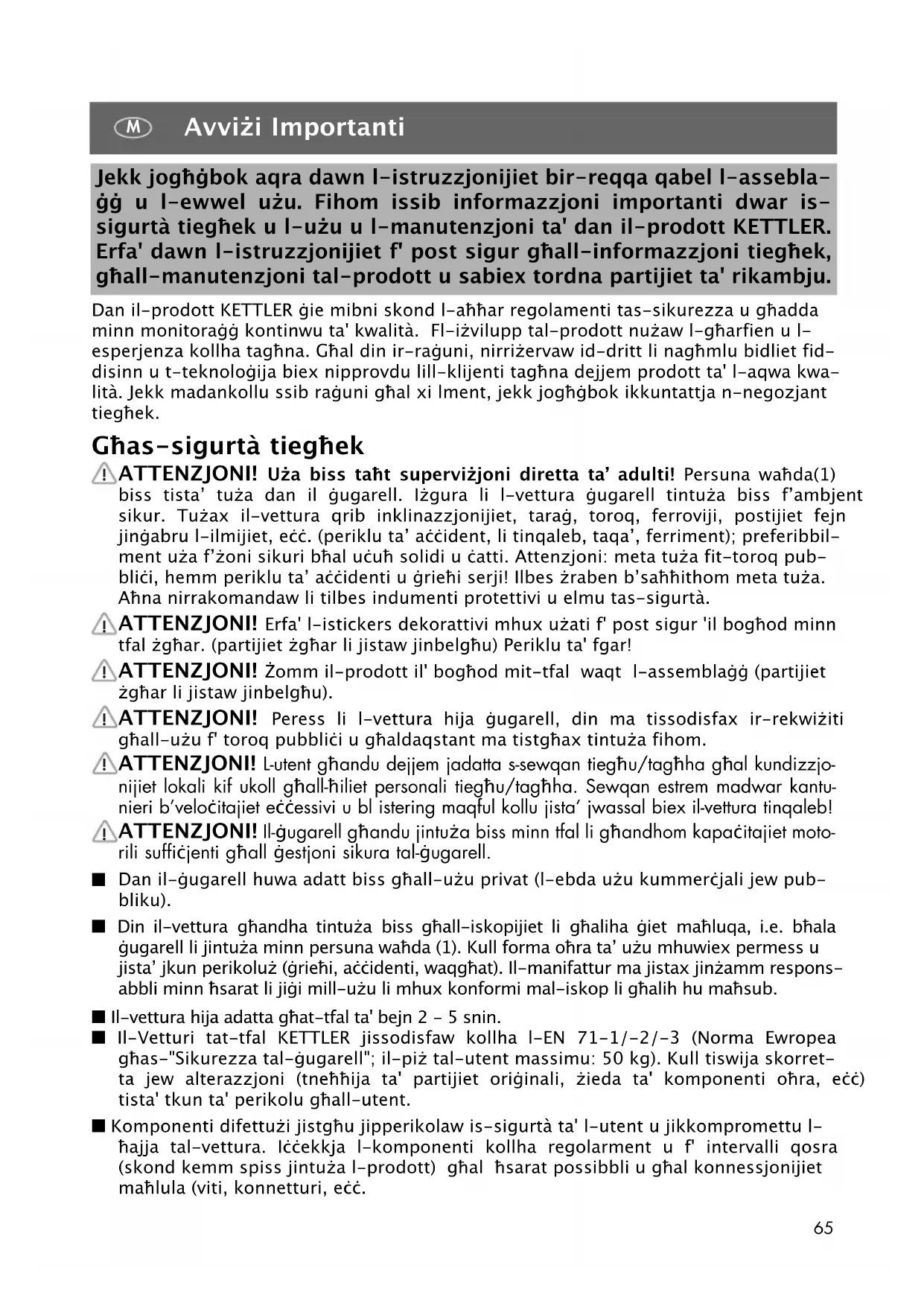 Dan il-ġugarell huwa adatt biss għall-użu privat (l-ebda użu kummerċjali jew pub- bliku). ■ Din il-vettura għandha tintuża biss għall-iskopijiet li għaliha ġiet maħluqa, i.e. bħala ġugarell li jintuża minn persuna waħda (1). Kull forma oħra ta’ użu mhuwiex permess u jista’ jkun perikoluż (ġrieħi, aċċidenti, waqgħat). Il-manifattur ma jistax jinżamm respons- abbli minn ħsarat li jiġi mill-użu li mhux konformi mal-iskop li għalih hu maħsub. ■ Il-vettura hija adatta għat-tfal ta' bejn 2 - 5 snin. ■ Il-Vetturi tat-tfal KETTLER jissodisfaw kollha l-EN 71-1/-2/-3 (Norma Ewropea għas-"Sikurezza tal-ġugarell"; il-piż tal-utent massimu: 50 kg). Kull tiswija skorret- ta jew alterazzjoni (tneħħija ta' partijiet oriġinali, żieda ta' komponenti oħra, eċċ) tista' tkun ta' perikolu għall-utent. ■ Komponenti difettużi jistgħu jipperikolaw is-sigurtà ta' l-utent u jikkompromettu l- ħajja tal-vettura. Iċċekkja l-komponenti kollha regolarment u f' intervalli qosra (skond kemm spiss jintuża l-prodott) għal ħsarat possibbli u għal konnessjonijiet maħlula (viti, konnetturi, eċċ. Jekk jogħġbok aqra dawn l-istruzzjonijiet bir-reqqa qabel l-assebla- ġġ u l-ewwel użu. Fihom issib informazzjoni importanti dwar is- sigurtà tiegħek u l-użu u l-manutenzjoni ta' dan il-prodott KETTLER. Erfa' dawn l-istruzzjonijiet f' post sigur għall-informazzjoni tiegħek, għall-manutenzjoni tal-prodott u sabiex tordna partijiet ta' rikambju.