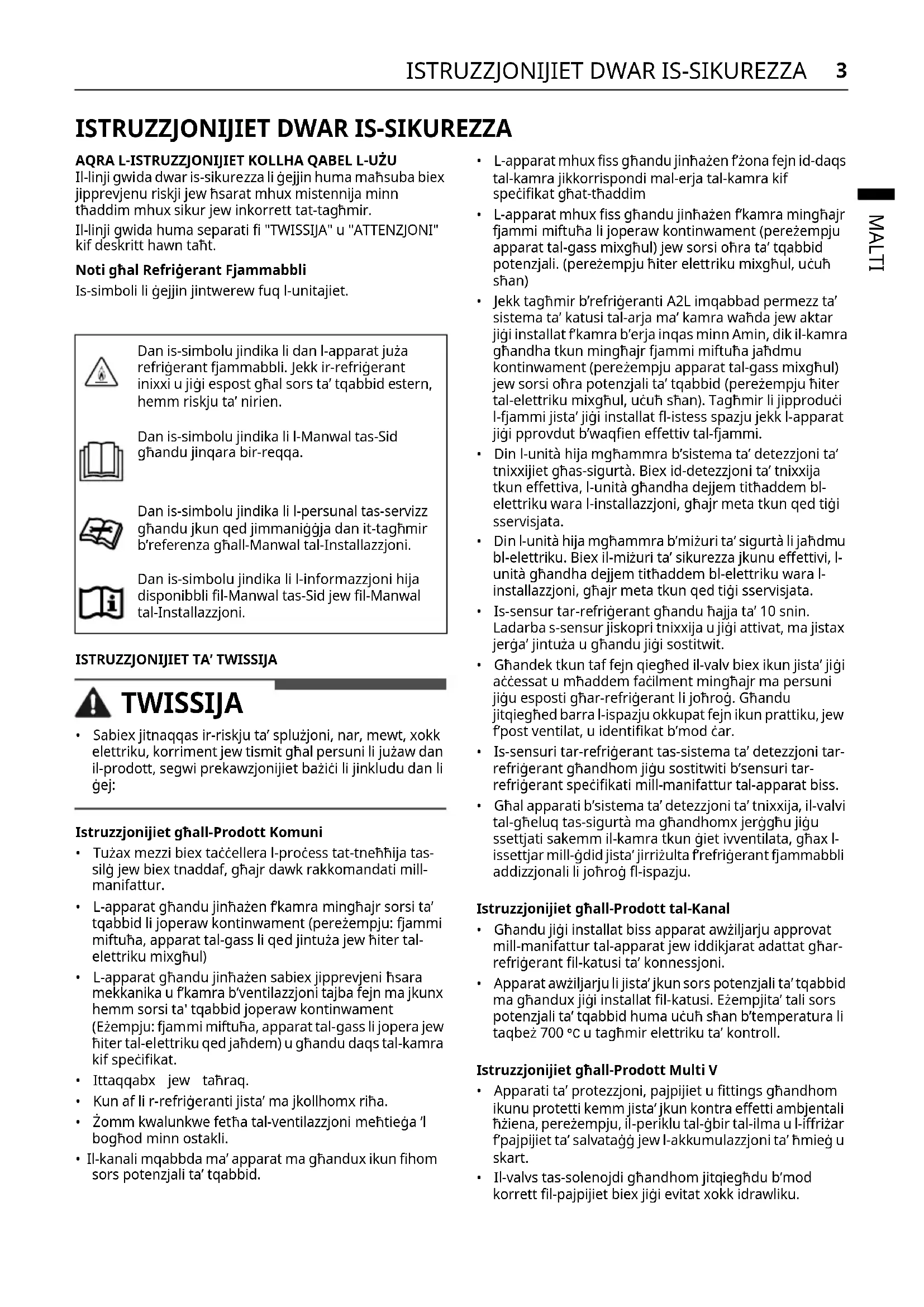 - Għal apparati b’sistema ta’ detezzjoni ta’ tnixxija, il-valvi tal-għeluq tas-sigurtà ma għandhomx jerġgħu jiġu ssettjati sakemm il-kamra tkun ġiet ivventilata, għax l- issettjar mill-ġdid jista’ jirriżulta f’refriġerant fjammabbli addizzjonali li joħroġ fl-ispazju. Istruzzjonijiet għall-Prodott tal-Kanal