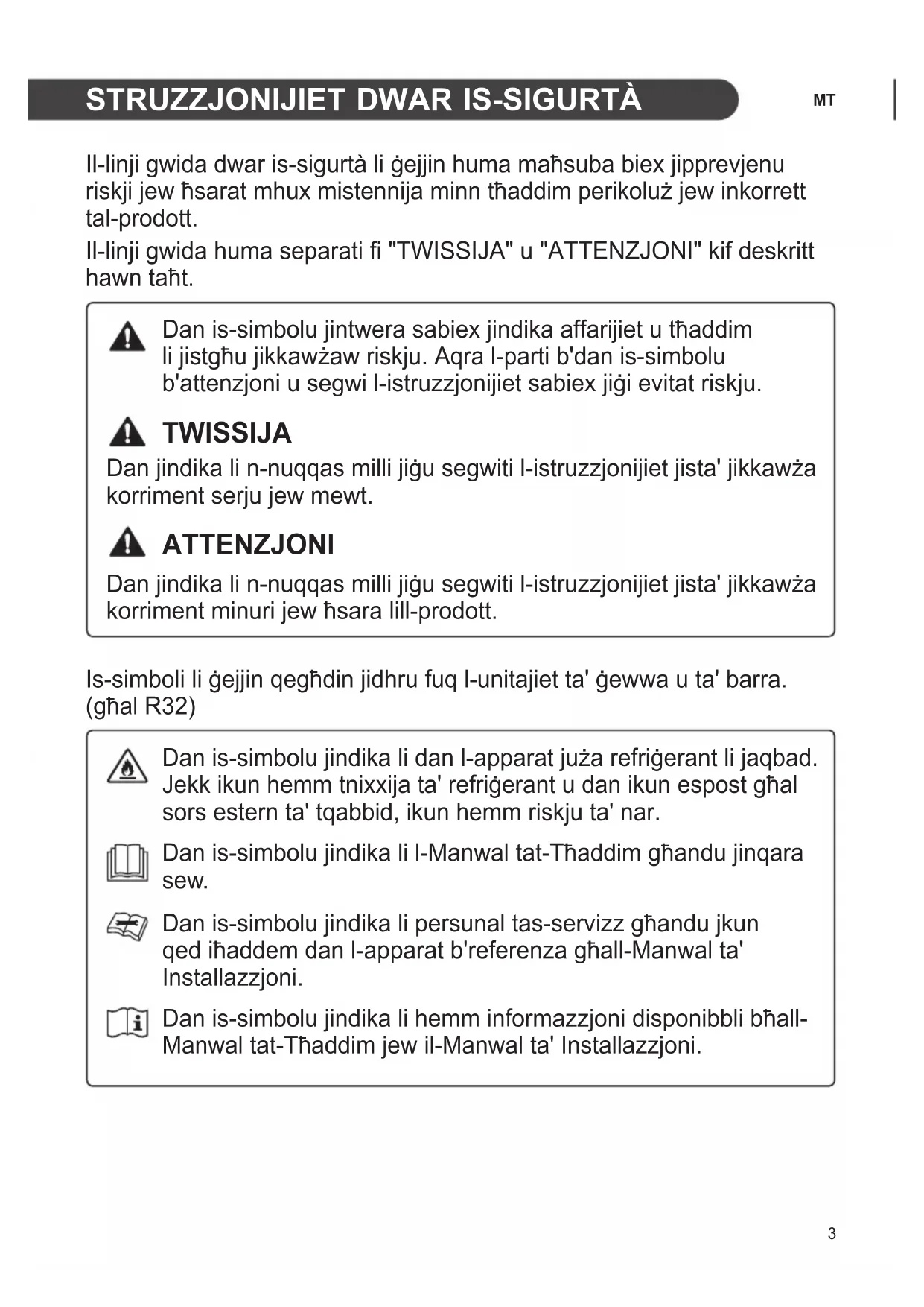 Il-linji gwida dwar is-sigurtà li ġejjin huma maħsuba biex jipprevjenu riskji jew ħsarat mhux mistennija minn tħaddim perikoluż jew inkorrett tal-prodott. Il-linji gwida huma separati fi "TWISSIJA" u "ATTENZJONI" kif deskritt hawn taħt. Dan is-simbolu jintwera sabiex jindika affarijiet u tħaddim li jistgħu jikkawżaw riskju. Aqra l-parti b'dan is-simbolu b'attenzjoni u segwi l-istruzzjonijiet sabiex jiġi evitat riskju. TWISSIJA Dan jindika li n-nuqqas milli jiġu segwiti l-istruzzjonijiet jista' jikkawża korriment serju jew mewt. ATTENZJONI Dan jindika li n-nuqqas milli jiġu segwiti l-istruzzjonijiet jista' jikkawża korriment minuri jew ħsara lill-prodott. Is-simboli li ġejjin qegħdin jidhru fuq l-unitajiet ta' ġewwa u ta' barra. (għal R32) Dan is-simbolu jindika li dan l-apparat juża refriġerant li jaqbad. Jekk ikun hemm tnixxija ta' refriġerant u dan ikun espost għal sors estern ta' tqabbid, ikun hemm riskju ta' nar. Dan is-simbolu jindika li l-Manwal tat-Tħaddim għandu jinqara sew. Dan is-simbolu jindika li persunal tas-servizz għandu jkun qed iħaddem dan l-apparat b'referenza għall-Manwal ta' Installazzjoni. Dan is-simbolu jindika li hemm informazzjoni disponibbli bħall- Manwal tat-Tħaddim jew il-Manwal ta' Installazzjoni.4