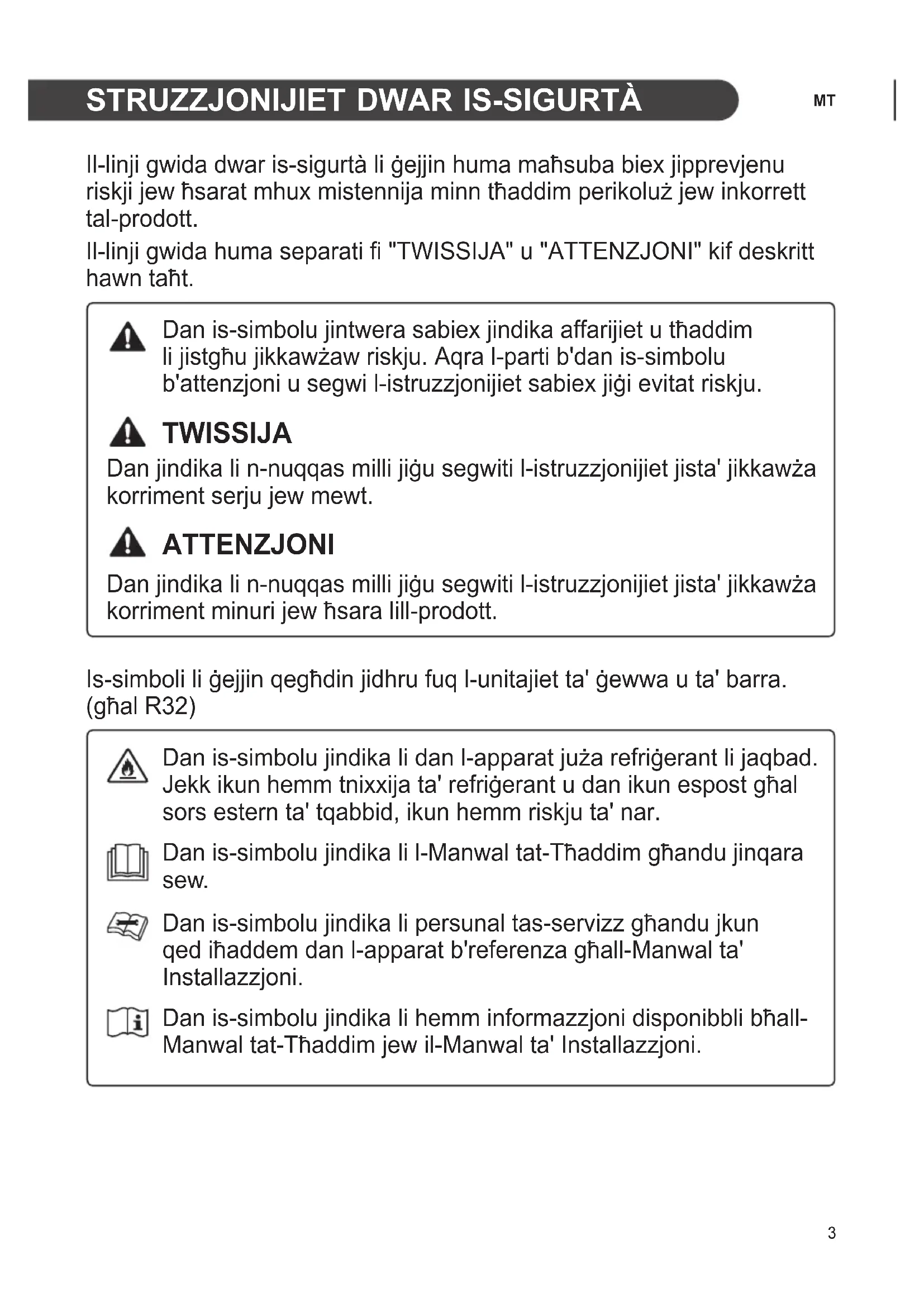 Il-linji gwida dwar is-sigurtà li ġejjin huma maħsuba biex jipprevjenu riskji jew ħsarat mhux mistennija minn tħaddim perikoluż jew inkorrett tal-prodott. Il-linji gwida huma separati fi "TWISSIJA" u "ATTENZJONI" kif deskritt hawn taħt. Dan is-simbolu jintwera sabiex jindika affarijiet u tħaddim li jistgħu jikkawżaw riskju. Aqra l-parti b'dan is-simbolu b'attenzjoni u segwi l-istruzzjonijiet sabiex jiġi evitat riskju. TWISSIJA Dan jindika li n-nuqqas milli jiġu segwiti l-istruzzjonijiet jista' jikkawża korriment serju jew mewt. ATTENZJONI Dan jindika li n-nuqqas milli jiġu segwiti l-istruzzjonijiet jista' jikkawża korriment minuri jew ħsara lill-prodott. Is-simboli li ġejjin qegħdin jidhru fuq l-unitajiet ta' ġewwa u ta' barra. (għal R32) Dan is-simbolu jindika li dan l-apparat juża refriġerant li jaqbad. Jekk ikun hemm tnixxija ta' refriġerant u dan ikun espost għal sors estern ta' tqabbid, ikun hemm riskju ta' nar. Dan is-simbolu jindika li l-Manwal tat-Tħaddim għandu jinqara sew. Dan is-simbolu jindika li persunal tas-servizz għandu jkun qed iħaddem dan l-apparat b'referenza għall-Manwal ta' Installazzjoni. Dan is-simbolu jindika li hemm informazzjoni disponibbli bħall- Manwal tat-Tħaddim jew il-Manwal ta' Installazzjoni.4