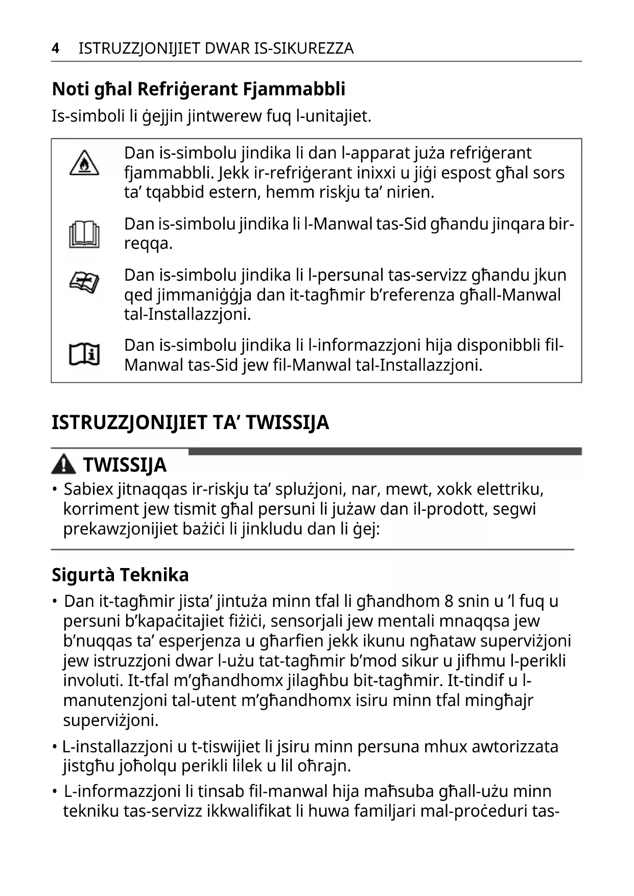 - L-installazzjoni u t-tiswijiet li jsiru minn persuna mhux awtorizzata jistgħu joħolqu perikli lilek u lil oħrajn.