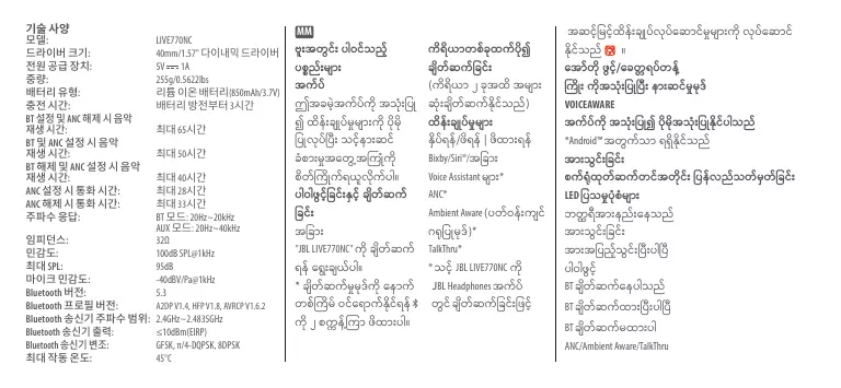 Choisissez de vous connecter à « JBL LIVE770NC ». * Pour revenir au jumelage, appuyez pendant 2 secondes sur . CONNEXION MULTIPOINT (2 appareils maximum) Autonomie de lecture de musique avec BT et RBA actifs : jusqu’à 50 heures Autonomie de lecture de musique avec BT inactive et RBA actif : jusqu’à 40 heures Autonomie de conversation avec RBA : jusqu’à 28 heures Autonomie de conversation sans RBA : jusqu’à 33 heures Réponse en fréquence : Mode BT : 20 Hz - 20 kHz Mode AUX : 20 Hz - 40 kHz Impédance : Tiempo de reproducción de música con la función Bluetooth activada y ANC desactivada: Tiempo de reproducción de música con las funciones de Bluetooth y ANC activadas: Tiempo de reproducción de música con la función Bluetooth desactivada y ANC activada: Tiempo de conversación con ANC activada: Tiempo de conversación con ANC desactivada: Respuesta en frecuencia: Impedancia: Sensibilidad: SPL máximo: Tempo de reprodução de música com BT ligado e ANC desligado: Tempo de reprodução de música com BT ligado e ANC ligado: Tempo de reprodução de música com BT desligado e ANC ligado: Tempo de conversação com o ANC ligado: Tempo de conversação com ANC desligado: Resposta de frequência: Impedância: Sensibilidade: SPL máximo: Temperatura máxima de uso: