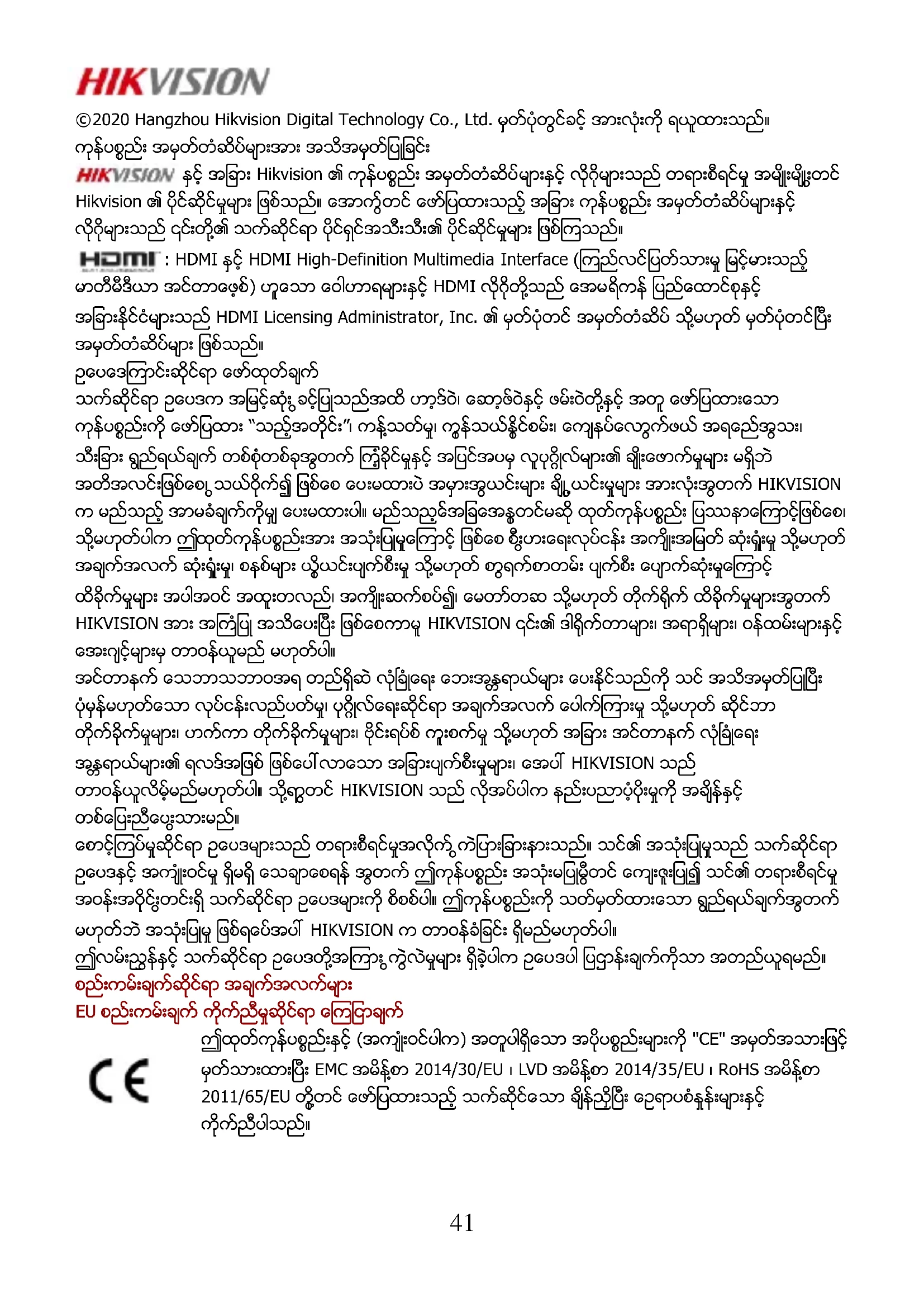 ဥပေဒဆိုင္ရာ အခ်က္အလက္မ်ား41 ©2020 Hangzhou Hikvision Digital Technology Co., Ltd. မွတ္ပုံတင္ခြင့္ အားလုံးကို ရယူထားသည္။ ကုန္ပစၥည္း အမွတ္တံဆိပ္မ်ားအား အသိအမွတ္ျပဳျခင္း ႏွင့္ အျခား Hikvision ၏ ကုန္ပစၥည္း အမွတ္တံဆိပ္မ်ားႏွင့္ လိုဂိုမ်ားသည္ တရားစီရင္မႈ အမ်ိဳးမ်ိဳးတြင္ Hikvision ၏ ပိုင္ဆိုင္မႈမ်ား ျဖစ္သည္။ ေအာက္တြင္ ေဖာ္ျပထားသည့္ အျခား ကုန္ပစၥည္း အမွတ္တံဆိပ္မ်ားႏွင့္ လိုဂိုမ်ားသည္ ၎တို႔၏ သက္ဆိုင္ရာ ပိုင္ရွင္အသီးသီး၏ ပိုင္ဆိုင္မႈမ်ား ျဖစ္ၾကသည္။ : HDMI ႏွင့္ HDMI High-Definition Multimedia Interface (ၾကည္လင္ျပတ္သားမႈ ျမင့္မားသည့္ မာတီမီဒီယာ အင္တာေဖ့စ္) ဟူေသာ ေဝါဟာရမ်ားႏွင့္ HDMI လိုဂိုတို႔သည္ အေမရိကန္ ျပည္ေထာင္စုႏွင့္ အျခားႏိုင္ငံမ်ားသည္ HDMI Licensing Administrator, Inc. ၏ မွတ္ပုံတင္ အမွတ္တံဆိပ္ သို႔မဟုတ္ မွတ္ပုံတင္ၿပီး အမွတ္တံဆိပ္မ်ား ျဖစ္သည္။ ဥပေဒေၾကာင္းဆိုင္ရာ ေဖာ္ထုတ္ခ်က္ သက္ဆိုင္ရာ ဥပေဒက အျမင့္ဆံုး ခြင့္ျပဳသည္အထိ ဟာ့ဒ္ဝဲ၊ ေဆာ့ဖ္ဝဲႏွင့္ ဖမ္းဝဲတို႔ႏွင့္ အတူ ေဖာ္ျပထားေသာ ကုန္ပစၥည္းကို ေဖာ္ျပထား “သည့္အတိုင္း”၊ ကန္႔သတ္မႈ၊ ကုန္သြယ္ႏိုင္စြမ္း၊ ေက်နပ္ေလာက္ဖြယ္ အရည္အေသြး၊ သီးျခား ရည္ရြယ္ခ်က္ တစ္စံုတစ္ခုအတြက္ ၾကံ့ခိုင္မႈႏွင့္ အျပင္အပမွ လူပုဂၢိဳလ္မ်ား၏ ခ်ဳိးေဖာက္မႈမ်ား မရွိဘဲ အတိအလင္းျဖစ္ေစ၊ သြယ္ဝိုက္၍ ျဖစ္ေစ ေပးမထားပဲ အမွားအယြင္းမ်ား ခ်ိဳ႕ယြင္းမႈမ်ား အားလံုးအတြက္ HIKVISION က မည္သည့္ အာမခံခ်က္ကိုမွ် ေပးမထားပါ။ မည္သည့္အေျခအေနတြင္မဆို ထုတ္ကုန္ပစၥည္း ျပႆနာေၾကာင့္ျဖစ္ေစ၊ သို႔မဟုတ္ပါက ဤထုတ္ကုန္ပစၥည္းအား အသုံးျပဳမႈေၾကာင့္ ျဖစ္ေစ စီးပြားေရးလုပ္ငန္း အက်ိဳးအျမတ္ ဆုံးရႈံးမႈ သို႔မဟုတ္ အခ်က္အလက္ ဆုံးရႈံးမႈ၊ စနစ္မ်ား ယိုယြင္းပ်က္စီးမႈ သို႔မဟုတ္ စာ႐ြက္စာတမ္း ပ်က္စီး ေပ်ာက္ဆုံးမႈေၾကာင့္ ထိခိုက္မႈမ်ား အပါအဝင္ အထူးတလည္၊ အက်ိဳးဆက္စပ္၍၊ မေတာ္တဆ သို႔မဟုတ္ တိုက္႐ိုက္ ထိခိုက္မႈမ်ားအတြက္ HIKVISION အား အႀကံျပဳ အသိေပးၿပီး ျဖစ္ေစကာမူ HIKVISION ၎၏ ဒါ႐ိုက္တာမ်ား၊ အရာရွိမ်ား၊ ဝန္ထမ္းမ်ားႏွင့္ ေအးဂ်င့္မ်ားမွ တာဝန္ယူမည္ မဟုတ္ပါ။ အင္တာနက္ သေဘာသဘာဝအရ တည္ရွိဆဲ လံုၿခံဳေရး ေဘးအႏၱရာယ္မ်ား ေပးႏိုင္သည္ကို သင္ အသိအမွတ္ျပဳၿပီး ပံုမွန္မဟုတ္ေသာ လုပ္ငန္းလည္ပတ္မႈ၊ ပုဂၢိဳလ္ေရးဆိုင္ရာ အခ်က္အလက္ ေပါက္ၾကားမႈ သို႔မဟုတ္ ဆိုင္ဘာ တိုက္ခိုက္မႈမ်ား၊ ဟက္ကာ တိုက္ခိုက္မႈမ်ား၊ ဗိုင္းရပ္စ္ ကူးစက္မႈ သို႔မဟုတ္ အျခား အင္တာနက္ လံုၿခံဳေရး အႏၱရာယ္မ်ား၏ ရလဒ္အျဖစ္ ျဖစ္ေပၚလာေသာ အျခားပ်က္စီးမႈမ်ား၊ အေပၚ HIKVISION သည္ တာဝန္ယူလိမ့္မည္မဟုတ္ပါ။ သို႔ရာတြင္ HIKVISION သည္ လိုအပ္ပါက နည္းပညာပံ့ပိုးမႈကို အခ်ိန္ႏွင့္ တစ္ေျပးညီေပးသြားမည္။ ေစာင့္ၾကပ္မႈဆိုင္ရာ ဥပေဒမ်ားသည္ တရားစီရင္မႈအလိုက္ ကြဲျပားျခားနားသည္။