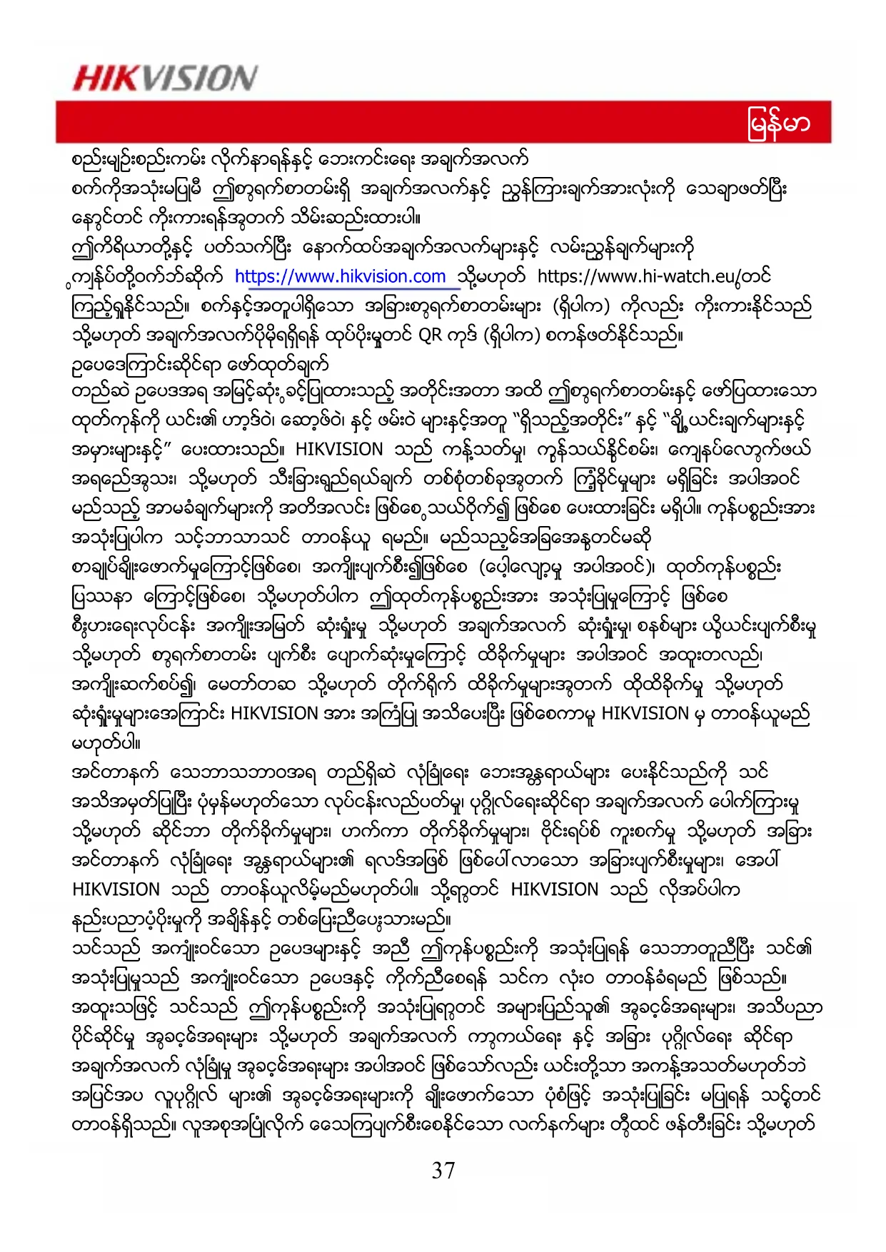 စည္းမ်ဥ္းစည္းကမ္း လိုက္နာရန္ႏွင့္ ေဘးကင္းေရး အခ်က္အလက္ စက္ကိုအသုံးမျပဳမီ ဤစာ႐ြက္စာတမ္းရွိ အခ်က္အလက္ႏွင့္ ၫႊန္ၾကားခ်က္အားလုံးကို ေသခ်ာဖတ္ၿပီး ေနာင္တြင္ ကိုးကားရန္အတြက္ သိမ္းဆည္းထားပါ။ ဤကိရိယာတို႔ႏွင့္ ပတ္သက္ၿပီး ေနာက္ထပ္အခ်က္အလက္မ်ားႏွင့္ လမ္းၫႊန္ခ်က္မ်ားကို ကြၽႏ္ုပ္တို႔ဝက္ဘ္ဆိုက္ https://www.hikvision.com သို႔မဟုတ္ https://www.hi-watch.eu/တြင္ ၾကည့္ရႈႏိုင္သည္။ စက္ႏွင့္အတူပါရွိေသာ အျခားစာရြက္စာတမ္းမ်ား (ရွိပါက) ကိုလည္း ကိုးကားႏိုင္သည္ သို႔မဟုတ္ အခ်က္အလက္ပိုမိုရရွိရန္ ထုပ္ပိုးမႈတြင္ QR ကုဒ္ (ရွိပါက) စကန္ဖတ္ႏိုင္သည္။ ဥပေဒေၾကာင္းဆိုင္ရာ ေဖာ္ထုတ္ခ်က္ တည္ဆဲ ဥပေဒအရ အျမင့္ဆံုး ခြင့္ျပဳထားသည့္ အတိုင္းအတာ အထိ ဤစာရြက္စာတမ္းနွင့္ ေဖာ္ျပထားေသာ ထုတ္ကုန္ကို ယင္း၏ ဟာ့ဒ္ဝဲ၊ ေဆာ့ဖ္ဝဲ၊ နွင့္ ဖမ္းဝဲ မ်ားနွင့္အတူ “ရွိသည့္အတိုင္း” နွင့္ “ခ်ို႕ယြင္းခ်က္မ်ားနွင့္ အမွားမ်ားနွင့္” ေပးထားသည္။ HIKVISION သည္ ကန႔္သတ္မႈ၊ ကုန္သြယ္ႏိုင္စြမ္း၊ ေက်နပ္ေလာက္ဖြယ္ အရည္အေသြး၊ သို႔မဟုတ္ သီးျခားရည္ရြယ္ခ်က္ တစ္စံုတစ္ခုအတြက္ ၾက့ံခိုင္မႈမ်ား မရွိျခင္း အပါအဝင္ မည္သည့္ အာမခံခ်က္မ်ားကို အတိအလင္း ျဖစ္ေစ သြယ္ဝိုက္၍ ျဖစ္ေစ ေပးထားျခင္း မရွိပါ။ ကုန္ပစၥည္းအား အသံုးျပဳပါက သင့္ဘာသာသင္ တာဝန္ယူ ရမည္။ မည္သည့္အေျခအေနတြင္မဆို စာခ်ဳပ္ခ်ိဳးေဖာက္မႈေၾကာင့္ျဖစ္ေစ၊ အက်ိဳးပ်က္စီး၍ျဖစ္ေစ (ေပါ့ေလ်ာ့မႈ အပါအဝင္)၊ ထုတ္ကုန္ပစၥည္း ျပႆနာ ေၾကာင့္ျဖစ္ေစ၊ သို႔မဟုတ္ပါက ဤထုတ္ကုန္ပစၥည္းအား အသုံးျပဳမႈေၾကာင့္ ျဖစ္ေစ စီးပြားေရးလုပ္ငန္း အက်ိဳးအျမတ္ ဆုံးရႈံးမႈ သို႔မဟုတ္ အခ်က္အလက္ ဆုံးရႈံးမႈ၊ စနစ္မ်ား ယိုယြင္းပ်က္စီးမႈ သို႔မဟုတ္ စာ႐ြက္စာတမ္း ပ်က္စီး ေပ်ာက္ဆုံးမႈေၾကာင့္ ထိခိုက္မႈမ်ား အပါအဝင္ အထူးတလည္၊ အက်ိဳးဆက္စပ္၍၊ မေတာ္တဆ သို႔မဟုတ္ တိုက္႐ိုက္ ထိခိုက္မႈမ်ားအတြက္ ထိုထိခိုက္မႈ သို႔မဟုတ္ ဆုံးရႈံးမႈမ်ားအေၾကာင္း HIKVISION အား အႀကံျပဳ အသိေပးၿပီး ျဖစ္ေစကာမူ HIKVISION မွ တာဝန္ယူမည္