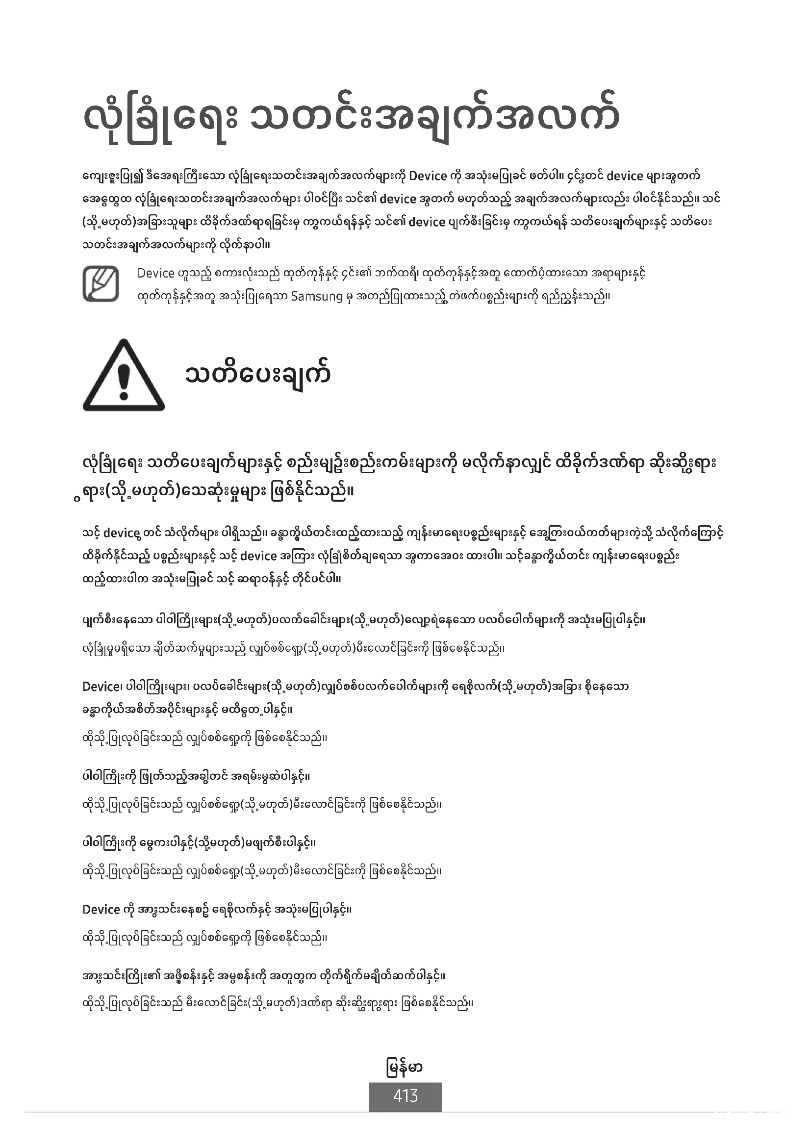 လံုၿခံဳေရး သတင္းအခ်က္အလက္ ေက်းဇူးျပဳ၍ ဒီအေရးႀကီးေသာ လံုၿခံဳေရးသတင္းအခ်က္အလက္မ်ားကို Device ကို အသံုးမျပဳခင္ ဖတ္ပါ။ ၄င္းတြင္ device မ်ားအတြက္ အေထြေထြ လံုၿခံဳေရးသတင္းအခ်က္အလက္မ်ား ပါ၀င္ၿပီး သင္၏ device အတြက္ မဟုတ္သည့္ အခ်က္အလက္မ်ားလည္း ပါ၀င္ႏိုင္သည္။ သင္ (သို႕မဟုတ္)အျခားသူမ်ား ထိခိုက္ဒဏ္ရာရျခင္းမွ ကာကြယ္ရ္ႏွင့္ သင္၏ device ပ်က္စီးျခင္းမွ ကာကြယ္ရ္ သတိေပးခ်က္မ်ားႏွင့္ သတိေပး သတင္းအခ်က္အလက္မ်ားကို လိုက္ာပါ။ Device ဟူသည့္ စကားလံုးသည္ ထုတ္ကုန္ႏွင့္ ၄င္း၏ ဘက္ထရီ၊ ထုတ္ကုန္ႏွင့္အတူ ေထာက္ပံ့ထားေသာ အရာမ်ားႏွင့္ ထုတ္ကုန္ႏွင့္အတူ အသံုးျပဳရေသာ Samsung မွ အတည္ျပဳထားသည့္ တြဲဖက္ပစၥည္းမ်ားကို ရည္ညႊန္းသည္။