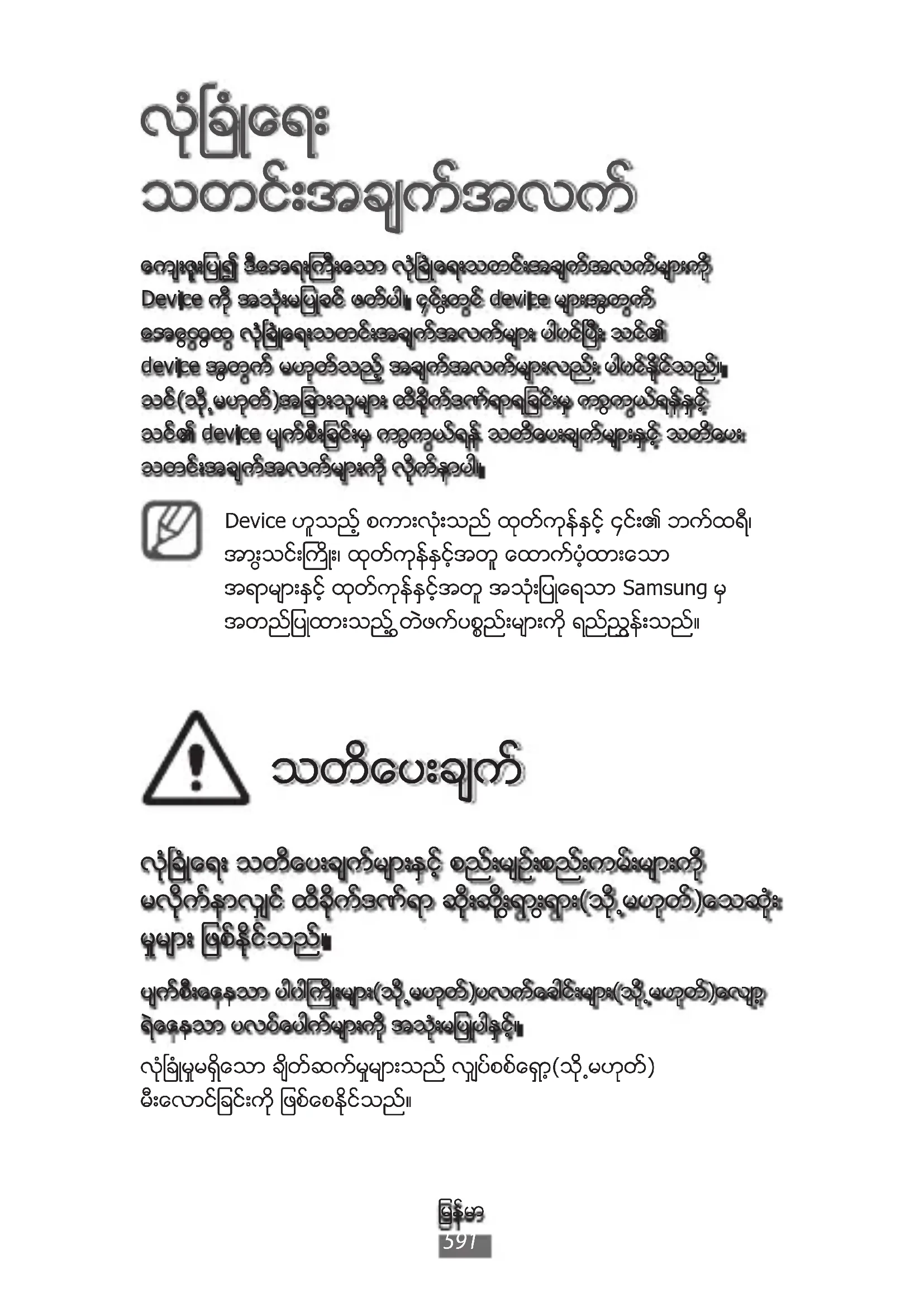 သတင္းအခ်က္အလက္ ေက်းဇူးျပဳ၍ ဒီအေရးႀကီးေသာ လံုၿခံဳေရးသတင္းအခ်က္အလက္မ်ားကို Device ကို အသံုးမျပဳခင္ ဖတ္ပါ။ ၄င္းတြင္ device မ်ားအတြက္ အေထြေထြ လံုၿခံဳေရးသတင္းအခ်က္အလက္မ်ား ပါ၀င္ၿပီး သင္၏ device အတြက္ မဟုတ္သည့္ အခ်က္အလက္မ်ားလည္း ပါ၀င္ႏိုင္သည္။ သင္(သို႕မဟုတ္)အျခားသူမ်ား ထိခိုက္ဒဏ္ရာရျခင္းမွ ကာကြယ္ရန္ႏွင့္ သင္၏ device ပ်က္စီးျခင္းမွ ကာကြယ္ရန္ သတိေပးခ်က္မ်ားႏွင့္ သတိေပး သတင္းအခ်က္အလက္မ်ားကို လိုက္နာပါ။ Device ဟူသည့္ စကားလံုးသည္ ထုတ္ကုန္ႏွင့္ ၄င္း၏ ဘက္ထရီ၊ အားသြင္းႀကိဳး၊ ထုတ္ကုန္ႏွင့္အတူ ေထာက္ပံ့ထားေသာ အရာမ်ားႏွင့္ ထုတ္ကုန္ႏွင့္အတူ အသံုးျပဳရေသာ Samsung မွ အတည္ျပဳထားသည့္ တြဲဖက္ပစၥည္းမ်ားကို ရည္ညႊန္းသည္။