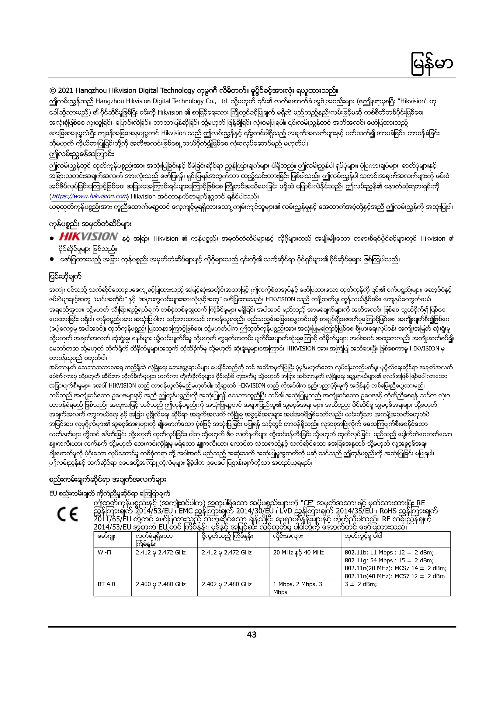 https://www.hikvision.com ) Hikvision အင္တာနက္စာမ်က္ႏွာတြင္ ရႏိုင္ပါသည္။ ယခုထုတ္ကုန္ပစၥည္းအား ကူညီေထာက္မရာတြင္ ေလ့က်င့္မႈရရွိထားေသာ ကြၽမ္းက်င္သူမ်ား၏ လမ္းၫႊန္မႈႏွင့္ အေထာက္အပံ့တို႔ႏွင့္အညီ ဤလမ္းၫႊန္ကို အသုံးျပဳပါ။ ကုန္ပစၥည္း အမွတ္တံဆိပ္မ်ား ႏွင့္ အျခား Hikvision ၏ ကုန္ပစၥည္း အမွတ္တံဆိပ္မ်ားႏွင့္ လိုဂိုမ်ားသည္ အမ်ဳိးမ်ဳိးေသာ တရားစီရင္ပိုင္ခြင့္မ်ားတြင္ Hikvision ၏ ပိုင္ဆိုင္မႈမ်ား ျဖစ္သည္။ ေဖာ္ျပထားသည့္ အျခား ကုန္ပစၥည္း အမွတ္တံဆိပ္မ်ားႏွင့္ လိုဂိုမ်ားသည္ ၎တို႔၏ သက္ဆိုင္ရာ ပိုင္ရွင္မ်ား၏ ပိုင္ဆိုင္မႈမ်ား ျဖစ္ၾကပါသည္။ ျငင္းဆိုခ်က္ အက်ဳံး ဝင္သည့္ သက္ဆိုင္ေသာဥပေဒက ခြင့္ျပဳထားသည့္ အျမင့္ဆံုးအတိုင္းအတာျဖင့္ ဤလက္စြဲစာအုပ္ႏွင့္ ေဖာ္ျပထားေသာ ထုတ္ကုန္ကို ၎၏ စက္ပစၥည္းမ်ား၊ ေဆာ့ဖ္ဝဲႏွင့္ ဖမ္းဝဲမ်ားနွင့္အတူ “ယင္းအတိုင္း” ႏွင့္ “အမွားအယြင္းမ်ားအားလံုးႏွင့္အတူ” ေဖာ္ျပထားသည္။ HIKVISION သည္ ကန႔္သတ္မႈ၊ ကုန္သြယ္ႏိုင္စြမ္း၊ ေက်နပ္ေလာက္ဖြယ္ အရည္အေသြး၊ သို႔မဟုတ္ သီးျခားရည္ရြယ္ခ်က္ တစ္စံုတစ္ခုအတြက္ ၾက့ံခိုင္မႈမ်ား မရွိျခင္း အပါအဝင္ မည္သည့္ အာမခံခ်က္မ်ားကို အတိအလင္း ျဖစ္ေစ သြယ္ဝိုက္၍ ျဖစ္ေစ ေပးထားျခင္း မရွိပါ။ ကုန္ပစၥည္းအား အသံုးျပဳပါက သင့္ဘာသာသင္ တာဝန္ယူရမည္။ မည္သည့္အေျခအေနတြင္မဆို စာခ်ဳပ္ခ်ိဳးေဖာက္မႈေၾကာင့္ျဖစ္ေစ၊ အက်ိဳးပ်က္စီး၍ျဖစ္ေစ (ေပါ့ေလ်ာ့မႈ အပါအဝင္)၊ ထုတ္ကုန္ပစၥည္း ျပႆနာေၾကာင့္ျဖစ္ေစ၊ သို႔မဟုတ္ပါက ဤထုတ္ကုန္ပစၥည္းအား အသုံးျပဳမႈေၾကာင့္ျဖစ္ေစ စီးပြားေရးလုပ္ငန္း အက်ိဳးအျမတ္ ဆုံးရႈံးမႈ သို႔မဟုတ္ အခ်က္အလက္ ဆုံးရႈံးမႈ၊ စနစ္မ်ား ယိုယြင္းပ်က္စီးမႈ သို႔မဟုတ္ စာ႐ြက္စာတမ္း ပ်က္စီးေပ်ာက္ဆုံးမႈေၾကာင့္ ထိခိုက္မႈမ်ား အပါအဝင္ အထူးတလည္၊ အက်ိဳးဆက္စပ္၍၊ မေတာ္တဆ သို႔မဟုတ္ တိုက္႐ိုက္ ထိခိုက္မႈမ်ားအတြက္ ထိုထိခိုက္မႈ သို႔မဟုတ္ ဆုံးရႈံးမႈမ်ားအေၾကာင္း HIKVISION အား အႀကံျပဳ အသိေပးၿပီး ျဖစ္ေစကာမူ HIKVISION မွ တာဝန္ယူမည္ မဟုတ္ပါ။ အင္တာနက္ သေဘာသဘာဝအရ တည္ရွိဆဲ လံုၿခံဳေရး ေဘးအႏၱရာယ္မ်ား ေပးႏိုင္သည္ကို သင္ အသိအမွတ္ျပဳၿပီး ပံုမွန္မဟုတ္ေသာ လုပ္ငန္းလည္ပတ္မႈ၊ ပုဂၢိဳလ္ေရးဆိုင္ရာ အခ်က္အလက္ ေပါက္ၾကားမႈ သို႔မဟုတ္ ဆိုင္ဘာ တိုက္ခိုက္မႈမ်ား၊ ဟက္ကာ တိုက္ခိုက္မႈမ်ား၊ ဗိုင္းရပ္စ္ ကူးစက္မႈ သို႔မဟုတ္ အျခား အင္တာနက္ လံုၿခံဳေရး အႏၱရာယ္မ်ား၏ ရလဒ္အျဖစ္ ျဖစ္ေပၚလာေသာ အျခားပ်က္စီးမႈမ်ား၊ အေပၚ HIKVISION သည္ တာဝန္ယူလိမ့္မည္မဟုတ္ပါ။ သို႔ရာတြင္ HIKVISION သည္ လိုအပ္ပါက နည္းပညာပံ့ပိုးမႈကို အခ်ိန္ႏွင့္ တစ္ေျပးညီေပးသြားမည္။ သင္သည္ အက်ံဳးဝင္ေသာ ဥပေဒမ်ားနွင့္ အညီ ဤကုန္ပစၥည္းကို အသံုးျပဳရန္ သေဘာတူညီၿပီး သင္၏ အသံုးျပဳမႈသည္