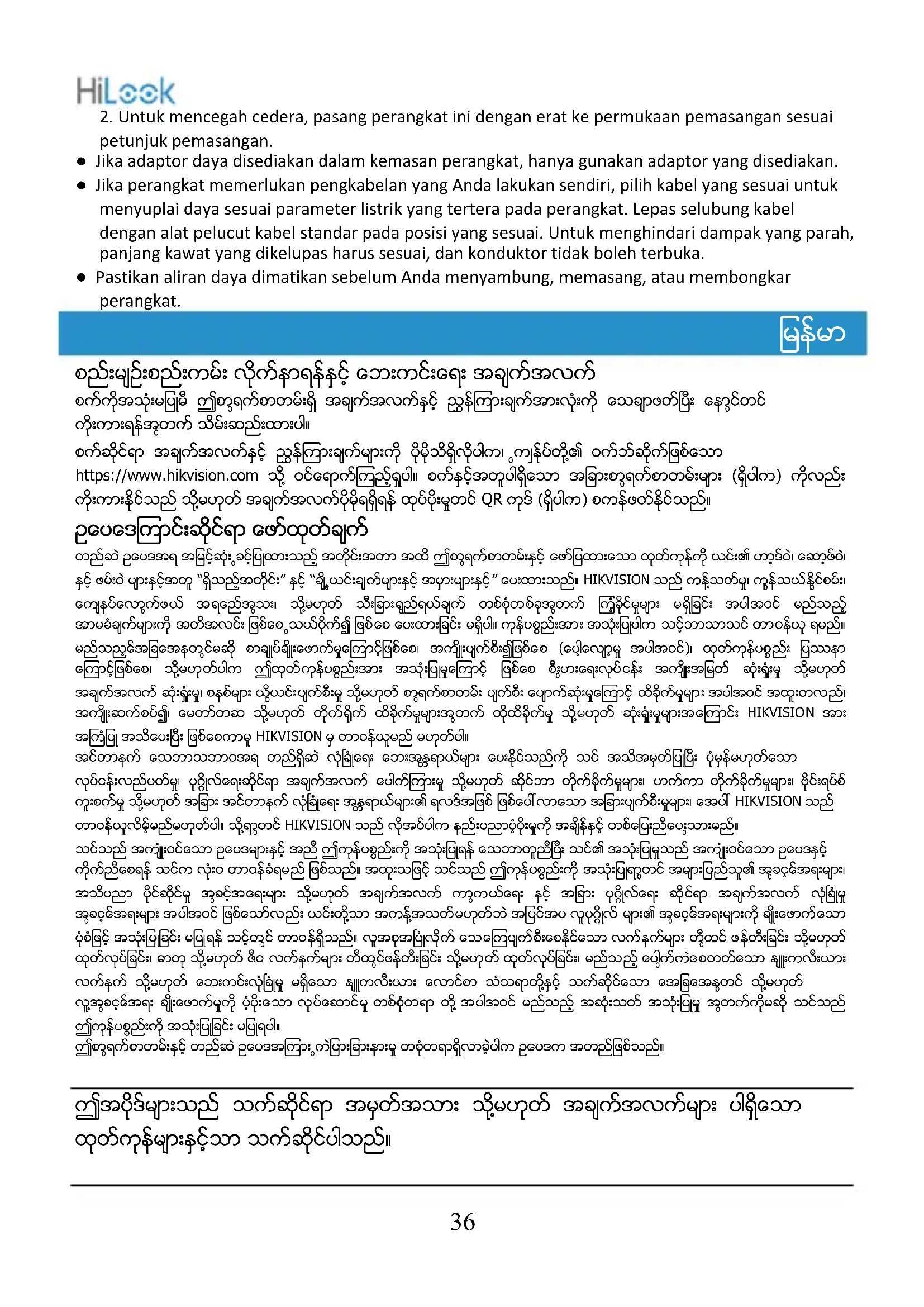 စည္းမ်ဥ္းစည္းကမ္း လိုက္နာရန္ႏွင့္ ေဘးကင္းေရး အခ်က္အလက္ စက္ကိုအသုံးမျပဳမီ ဤစာ႐ြက္စာတမ္းရွိ အခ်က္အလက္ႏွင့္ ၫႊန္ၾကားခ်က္အားလုံးကို ေသခ်ာဖတ္ၿပီး ေနာင္တြင္ ကိုးကားရန္အတြက္ သိမ္းဆည္းထားပါ။ စက္ဆိုင္ရာ အခ်က္အလက္ႏွင့္ ၫႊန္ၾကားခ်က္မ်ားကို ပိုမိုသိရွိလိုပါက၊ ကြၽႏ္ုပ္တို႔၏ ဝက္ဘ္ဆိုက္ျဖစ္ေသာ https://www.hikvision.com သို႔ ဝင္ေရာက္ၾကည့္ရႈပါ။ စက္ႏွင့္အတူပါရွိေသာ အျခားစာရြက္စာတမ္းမ်ား (ရွိပါက) ကိုလည္း ကိုးကားႏိုင္သည္ သို႔မဟုတ္ အခ်က္အလက္ပိုမိုရရွိရန္ ထုပ္ပိုးမႈတြင္ QR ကုဒ္ (ရွိပါက) စကန္ဖတ္ႏိုင္သည္။ ဥပေဒေၾကာင္းဆိုင္ရာ ေဖာ္ထုတ္ခ်က္ တည္ဆဲ ဥပေဒအရ အျမင့္ဆံုး ခြင့္ျပဳထားသည့္ အတိုင္းအတာ အထိ ဤစာရြက္စာတမ္းနွင့္ ေဖာ္ျပထားေသာ ထုတ္ကုန္ကို ယင္း၏ ဟာ့ဒ္ဝဲ၊ ေဆာ့ဖ္ဝဲ၊ နွင့္ ဖမ္းဝဲ မ်ားနွင့္အတူ “ရွိသည့္အတိုင္း” နွင့္ “ခ်ို႕ယြင္းခ်က္မ်ားနွင့္ အမွားမ်ားနွင့္” ေပးထားသည္။ HIKVISION သည္ ကန႔္သတ္မႈ၊ ကုန္သြယ္ႏိုင္စြမ္း၊ ေက်နပ္ေလာက္ဖြယ္ အရည္အေသြး၊ သို႔မဟုတ္ သီးျခားရည္ရြယ္ခ်က္ တစ္စံုတစ္ခုအတြက္ ၾက့ံခိုင္မႈမ်ား မရွိျခင္း အပါအဝင္ မည္သည့္ အာမခံခ်က္မ်ားကို အတိအလင္း ျဖစ္ေစ သြယ္ဝိုက္၍ ျဖစ္ေစ ေပးထားျခင္း မရွိပါ။ ကုန္ပစၥည္းအား အသံုးျပဳပါက သင့္ဘာသာသင္ တာဝန္ယူ ရမည္။ မည္သည့္အေျခအေနတြင္မဆို စာခ်ဳပ္ခ်ိဳးေဖာက္မႈေၾကာင့္ျဖစ္ေစ၊ အက်ိဳးပ်က္စီး၍ျဖစ္ေစ (ေပါ့ေလ်ာ့မႈ အပါအဝင္)၊ ထုတ္ကုန္ပစၥည္း ျပႆနာ ေၾကာင့္ျဖစ္ေစ၊ သို႔မဟုတ္ပါက ဤထုတ္ကုန္ပစၥည္းအား အသုံးျပဳမႈေၾကာင့္ ျဖစ္ေစ စီးပြားေရးလုပ္ငန္း အက်ိဳးအျမတ္ ဆုံးရႈံးမႈ သို႔မဟုတ္ အခ်က္အလက္ ဆုံးရႈံးမႈ၊ စနစ္မ်ား ယိုယြင္းပ်က္စီးမႈ သို႔မဟုတ္ စာ႐ြက္စာတမ္း ပ်က္စီး ေပ်ာက္ဆုံးမႈေၾကာင့္ ထိခိုက္မႈမ်ား အပါအဝင္ အထူးတလည္၊ အက်ိဳးဆက္စပ္၍၊ မေတာ္တဆ သို႔မဟုတ္ တိုက္႐ိုက္ ထိခိုက္မႈမ်ားအတြက္ ထိုထိခိုက္မႈ သို႔မဟုတ္ ဆုံးရႈံးမႈမ်ားအေၾကာင္း HIKVISION အား အႀကံျပဳ အသိေပးၿပီး ျဖစ္ေစကာမူ HIKVISION မွ တာဝန္ယူမည္ မဟုတ္ပါ။ အင္တာနက္ သေဘာသဘာဝအရ တည္ရွိဆဲ လံုၿခံဳေရး ေဘးအႏၱရာယ္မ်ား ေပးႏိုင္သည္ကို သင္ အသိအမွတ္ျပဳၿပီး ပံုမွန္မဟုတ္ေသာ လုပ္ငန္းလည္ပတ္မႈ၊ ပုဂၢိဳလ္ေရးဆိုင္ရာ အခ်က္အလက္ ေပါက္ၾကားမႈ သို႔မဟုတ္ ဆိုင္ဘာ တိုက္ခိုက္မႈမ်ား၊ ဟက္ကာ တိုက္ခိုက္မႈမ်ား၊ ဗိုင္းရပ္စ္ ကူးစက္မႈ သို႔မဟုတ္ အျခား အင္တာနက္ လံုၿခံဳေရး အႏၱရာယ္မ်ား၏ ရလဒ္အျဖစ္ ျဖစ္ေပၚလာေသာ အျခားပ်က္စီးမႈမ်ား၊ အေပၚ HIKVISION သည္ တာဝန္ယူလိမ့္မည္မဟုတ္ပါ။ သို႔ရာတြင္ HIKVISION သည္ လိုအပ္ပါက နည္းပညာပံ့ပိုးမႈကို အခ်ိန္ႏွင့္ တစ္ေျပးညီေပးသြားမည္။ သင္သည္ အက်ံဳးဝင္ေသာ ဥပေဒမ်ားနွင့္ အညီ ဤကုန္ပစၥည္းကို အသံုးျပဳရန္ သေဘာတူညီၿပီး သင္၏ အသံုးျပဳမႈသည္ အက်ံဳးဝင္