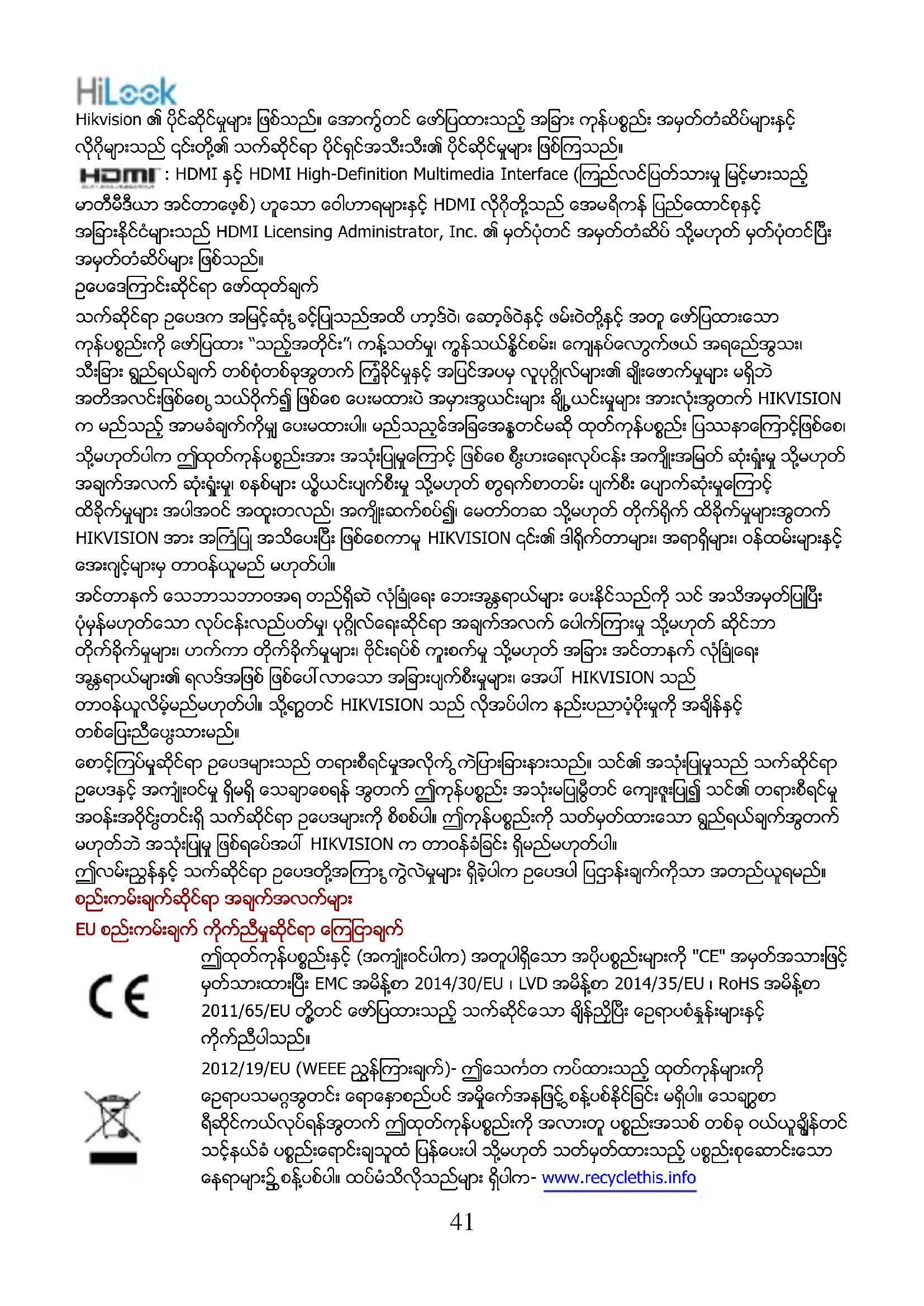 ဥပေဒဆိုင္ရာ အခ်က္အလက္မ်ား ©2020 Hangzhou Hikvision Digital Technology Co., Ltd. မွတ္ပုံတင္ခြင့္ အားလုံးကို ရယူထားသည္။ ကုန္ပစၥည္း အမွတ္တံဆိပ္မ်ားအား အသိအမွတ္ျပဳျခင္း ႏွင့္ အျခား Hikvision ၏ ကုန္ပစၥည္း အမွတ္တံဆိပ္မ်ားႏွင့္ လိုဂိုမ်ားသည္ တရားစီရင္မႈ အမ်ိဳးမ်ိဳးတြင္41 Hikvision ၏ ပိုင္ဆိုင္မႈမ်ား ျဖစ္သည္။ ေအာက္တြင္ ေဖာ္ျပထားသည့္ အျခား ကုန္ပစၥည္း အမွတ္တံဆိပ္မ်ားႏွင့္ လိုဂိုမ်ားသည္ ၎တို႔၏ သက္ဆိုင္ရာ ပိုင္ရွင္အသီးသီး၏ ပိုင္ဆိုင္မႈမ်ား ျဖစ္ၾကသည္။ : HDMI ႏွင့္ HDMI High-Definition Multimedia Interface (ၾကည္လင္ျပတ္သားမႈ ျမင့္မားသည့္ မာတီမီဒီယာ အင္တာေဖ့စ္) ဟူေသာ ေဝါဟာရမ်ားႏွင့္ HDMI လိုဂိုတို႔သည္ အေမရိကန္ ျပည္ေထာင္စုႏွင့္ အျခားႏိုင္ငံမ်ားသည္ HDMI Licensing Administrator, Inc. ၏ မွတ္ပုံတင္ အမွတ္တံဆိပ္ သို႔မဟုတ္ မွတ္ပုံတင္ၿပီး အမွတ္တံဆိပ္မ်ား ျဖစ္သည္။ ဥပေဒေၾကာင္းဆိုင္ရာ ေဖာ္ထုတ္ခ်က္ သက္ဆိုင္ရာ ဥပေဒက အျမင့္ဆံုး ခြင့္ျပဳသည္အထိ ဟာ့ဒ္ဝဲ၊ ေဆာ့ဖ္ဝဲႏွင့္ ဖမ္းဝဲတို႔ႏွင့္ အတူ ေဖာ္ျပထားေသာ ကုန္ပစၥည္းကို ေဖာ္ျပထား “သည့္အတိုင္း”၊ ကန္႔သတ္မႈ၊ ကုန္သြယ္ႏိုင္စြမ္း၊ ေက်နပ္ေလာက္ဖြယ္ အရည္အေသြး၊ သီးျခား ရည္ရြယ္ခ်က္ တစ္စံုတစ္ခုအတြက္ ၾကံ့ခိုင္မႈႏွင့္ အျပင္အပမွ လူပုဂၢိဳလ္မ်ား၏ ခ်ဳိးေဖာက္မႈမ်ား မရွိဘဲ အတိအလင္းျဖစ္ေစ၊ သြယ္ဝိုက္၍ ျဖစ္ေစ ေပးမထားပဲ အမွားအယြင္းမ်ား ခ်ိဳ႕ယြင္းမႈမ်ား အားလံုးအတြက္ HIKVISION က မည္သည့္ အာမခံခ်က္ကိုမွ် ေပးမထားပါ။ မည္သည့္အေျခအေနတြင္မဆို ထုတ္ကုန္ပစၥည္း ျပႆနာေၾကာင့္ျဖစ္ေစ၊ သို႔မဟုတ္ပါက ဤထုတ္ကုန္ပစၥည္းအား အသုံးျပဳမႈေၾကာင့္ ျဖစ္ေစ စီးပြားေရးလုပ္ငန္း အက်ိဳးအျမတ္ ဆုံးရႈံးမႈ သို႔မဟုတ္ အခ်က္အလက္ ဆုံးရႈံးမႈ၊ စနစ္မ်ား ယိုယြင္းပ်က္စီးမႈ သို႔မဟုတ္ စာ႐ြက္စာတမ္း ပ်က္စီး ေပ်ာက္ဆုံးမႈေၾကာင့္ ထိခိုက္မႈမ်ား အပါအဝင္ အထူးတလည္၊ အက်ိဳးဆက္စပ္၍၊ မေတာ္တဆ သို႔မဟုတ္ တိုက္႐ိုက္ ထိခိုက္မႈမ်ားအတြက္ HIKVISION အား အႀကံျပဳ အသိေပးၿပီး ျဖစ္ေစကာမူ HIKVISION ၎၏ ဒါ႐ိုက္တာမ်ား၊ အရာရွိမ်ား၊ ဝန္ထမ္းမ်ားႏွင့္ ေအးဂ်င့္မ်ားမွ တာဝန္ယူမည္ မဟုတ္ပါ။ အင္တာနက္ သေဘာသဘာဝအရ တည္ရွိဆဲ လံုၿခံဳေရး ေဘးအႏၱရာယ္မ်ား ေပးႏိုင္သည္ကို သင္ အသိအမွတ္ျပဳၿပီး ပံုမွန္မဟုတ္ေသာ လုပ္ငန္းလည္ပတ္မႈ၊ ပုဂၢိဳလ္ေရးဆိုင္ရာ အခ်က္အလက္ ေပါက္ၾကားမႈ သို႔မဟုတ္ ဆိုင္ဘာ တိုက္ခိုက္မႈမ်ား၊ ဟက္ကာ တိုက္ခိုက္မႈမ်ား၊ ဗိုင္းရပ္စ္ ကူးစက္မႈ သို႔မဟုတ္ အျခား အင္တာနက္ လံုၿခံဳေရး အႏၱရာယ္မ်ား၏ ရလဒ္အျဖစ္ ျဖစ္ေပၚလာေသာ အျခားပ်က္စီးမႈမ်ား၊ အေပၚ HIKVISION သည္ တာဝန္ယူလိမ့္မည္မဟုတ္ပါ။ သို႔ရာတြင္ HIKVISION သည္ လိုအပ္ပါက နည္းပညာပံ့ပိုးမႈကို အခ်ိန္ႏွင့္ တစ္ေျပးညီေပးသြားမည္။ ေစာင့္ၾကပ္မႈဆိုင္ရာ ဥပေဒမ်ားသည္ တရားစီရင္မႈအလိုက္ ကြဲျပားျခားနားသည္။