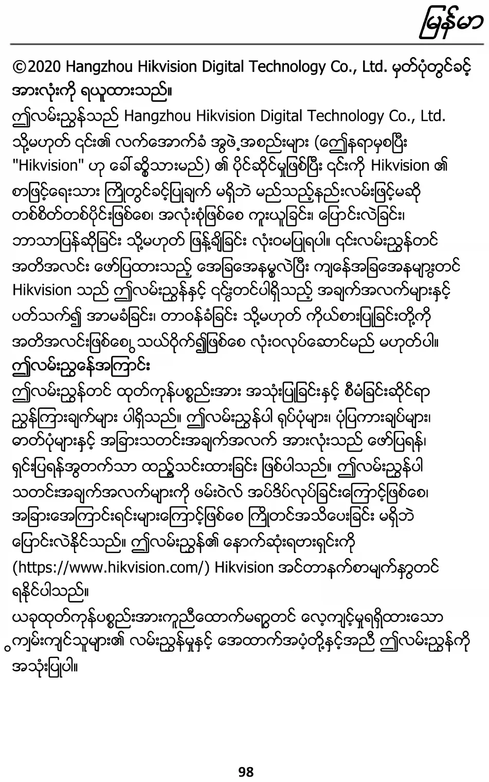 ©2020 Hangzhou Hikvision Digital Technology Co., Ltd. မွတ္ပုံတင္ခြင့္ အားလုံးကို ရယူထားသည္။ ဤလမ္းၫႊန္သည္ Hangzhou Hikvision Digital Technology Co., Ltd. သို႔မဟုတ္ ၎၏ လက္ေအာက္ခံ အဖြဲ႕အစည္းမ်ား (ဤေနရာမွစၿပီး "Hikvision" ဟု ေခၚဆိုသြားမည္) ၏ ပိုင္ဆိုင္မႈျဖစ္ၿပီး ၎ကို Hikvision ၏ စာျဖင့္ေရးသား ႀကိဳတင္ခြင့္ျပဳခ်က္ မရွိဘဲ မည္သည့္နည္းလမ္းျဖင့္မဆို တစ္စိတ္တစ္ပိုင္းျဖစ္ေစ၊ အလုံးစုံျဖစ္ေစ ကူးယူျခင္း၊ ေျပာင္းလဲျခင္း၊ ဘာသာျပန္ဆိုျခင္း သို႔မဟုတ္ ျဖန႔္ခ်ိျခင္း လုံးဝမျပဳရပါ။ ၎လမ္းၫႊန္တြင္ အတိအလင္း ေဖာ္ျပထားသည့္ အေျခအေနမွလြဲၿပီး က်န္အေျခအေနမ်ားတြင္ Hikvision သည္ ဤလမ္းၫႊန္ႏွင့္ ၎တြင္ပါရွိသည့္ အခ်က္အလက္မ်ားႏွင့္ ပတ္သက္၍ အာမခံျခင္း၊ တာဝန္ခံျခင္း သို႔မဟုတ္ ကိုယ္စားျပဳျခင္းတို႔ကို အတိအလင္းျဖစ္ေစ၊ သြယ္ဝိုက္၍ျဖစ္ေစ လုံးဝလုပ္ေဆာင္မည္ မဟုတ္ပါ။ ဤလမ္းၫႊန္အေၾကာင္း ဤလမ္းၫႊန္တြင္ ထုတ္ကုန္ပစၥည္းအား အသုံးျပဳျခင္းႏွင့္ စီမံျခင္းဆိုင္ရာ ၫႊန္ၾကားခ်က္မ်ား ပါရွိသည္။ ဤလမ္းၫႊန္ပါ ႐ုပ္ပုံမ်ား၊ ပုံျပကားခ်ပ္မ်ား၊ ဓာတ္ပုံမ်ားႏွင့္ အျခားသတင္းအခ်က္အလက္ အားလုံးသည္ ေဖာ္ျပရန္၊ ရွင္းျပရန္အတြက္သာ ထည့္သြင္းထားျခင္း ျဖစ္ပါသည္။ ဤလမ္းၫႊန္ပါ သတင္းအခ်က္အလက္မ်ားကို ဖမ္းဝဲလ္ အပ္ဒိပ္လုပ္ျခင္းေၾကာင့္ျဖစ္ေစ၊ အျခားအေၾကာင္းရင္းမ်ားေၾကာင့္ျဖစ္ေစ ႀကိဳတင္အသိေပးျခင္း မရွိဘဲ ေျပာင္းလဲႏိုင္သည္။ ဤလမ္းၫႊန္၏ ေနာက္ဆုံးရဗားရွင္းကို (https://www.hikvision.com/) Hikvision အင္တာနက္စာမ်က္ႏွာတြင္ ရႏိုင္ပါသည္။ ယခုထုတ္ကုန္ပစၥည္းအားကူညီေထာက္မရာတြင္ ေလ့က်င့္မႈရရွိထားေသာ ကြၽမ္းက်င္သူမ်ား၏ လမ္းၫႊန္မႈႏွင့္ အေထာက္အပံ့တို႔ႏွင့္အညီ ဤလမ္းၫႊန္ကို အသုံးျပဳပါ။ျမန္မာ