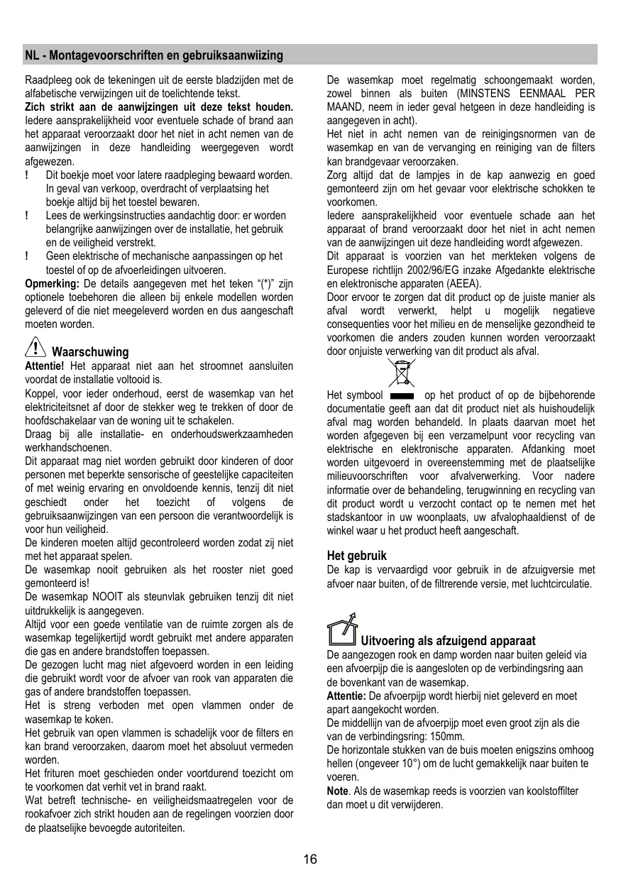 De wasemkap moet regelmatig schoongemaakt worden, zowel binnen als buiten (MINSTENS EENMAAL PER MAAND, neem in ieder geval hetgeen in deze handleiding is aangegeven in acht). Het niet in acht nemen van de reinigingsnormen van de wasemkap en van de vervanging en reiniging van de filters kan brandgevaar veroorzaken. Zorg altijd dat de lampjes in de kap aanwezig en goed gemonteerd zijn om het gevaar voor elektrische schokken te voorkomen. Iedere aansprakelijkheid voor eventuele schade aan het apparaat of brand veroorzaakt door het niet in acht nemen van de aanwijzingen uit deze handleiding wordt afgewezen. Dit apparaat is voorzien van het merkteken volgens de Europese richtlijn 2002/96/EG inzake Afgedankte elektrische en elektronische apparaten (AEEA). Door ervoor te zorgen dat dit product op de juiste manier als afval wordt verwerkt, helpt u mogelijk negatieve consequenties voor het milieu en de menselijke gezondheid te voorkomen die anders zouden kunnen worden veroorzaakt door onjuiste verwerking van dit product als afval.