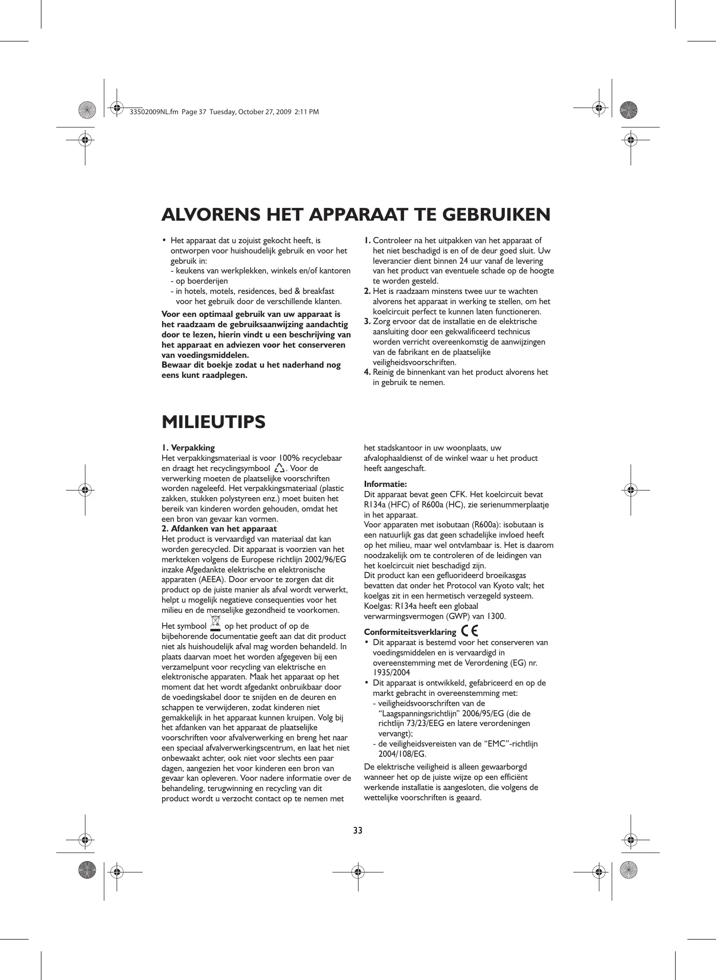 Het product is vervaardigd van materiaal dat kan worden gerecycled. Dit apparaat is voorzien van het merkteken volgens de Europese richtlijn 2002/96/EG inzake Afgedankte elektrische en elektronische apparaten (AEEA). Door ervoor te zorgen dat dit product op de juiste manier als afval wordt verwerkt, helpt u mogelijk negatieve consequenties voor het milieu en de menselijke gezondheid te voorkomen. Informatie: Dit apparaat bevat geen CFK. Het koelcircuit bevat R134a (HFC) of R600a (HC), zie serienummerplaatje in het apparaat. Voor apparaten met isobutaan (R600a): isobutaan is een natuurlijk gas dat geen schadelijke invloed heeft op het milieu, maar wel ontvlambaar is. Het is daarom noodzakelijk om te controleren of de leidingen van het koelcircuit niet beschadigd zijn. Dit product kan een gefluorideerd broeikasgas bevatten dat onder het Protocol van Kyoto valt; het koelgas zit in een hermetisch verzegeld systeem. Koelgas: R134a heeft een globaal verwarmingsvermogen (GWP) van 1300. Het symbool op het product of op de bijbehorende documentatie geeft aan dat dit product niet als huishoudelijk afval mag worden behandeld. In plaats daarvan moet het worden afgegeven bij een verzamelpunt voor recycling van elektrische en elektronische apparaten. Maak het apparaat op het moment dat het wordt afgedankt onbruikbaar door de voedingskabel door te snijden en de deuren en schappen te verwijderen, zodat kinderen niet gemakkelijk in het apparaat kunnen kruipen. Volg bij het afdanken van het apparaat de plaatselijke voorschriften voor afvalverwerking en breng het naar een speciaal afvalverwerkingscentrum, en laat het niet onbewaakt achter, ook niet voor slechts een paar dagen, aangezien het voor kinderen een bron van gevaar kan opleveren. Voor nadere informatie over de behandeling, terugwinning en recycling van dit product wordt u verzocht contact op te nemen met Conformiteitsverklaring