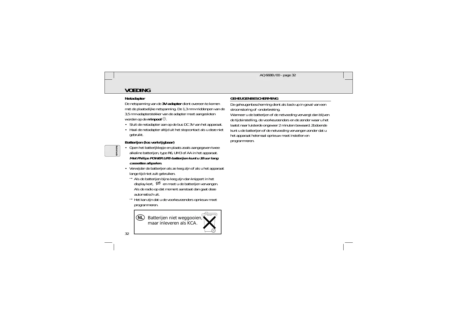 AQ 6688 /00 - page 32 VOEDING Netadapter De netspanning van de 3V-adapter dient overeen te komen met de plaatselijke netspanning. De 1,3 mm-middenpen van de 3,5 mm-adapterstekker van de adapter moet aangesloten worden op de minpool -.