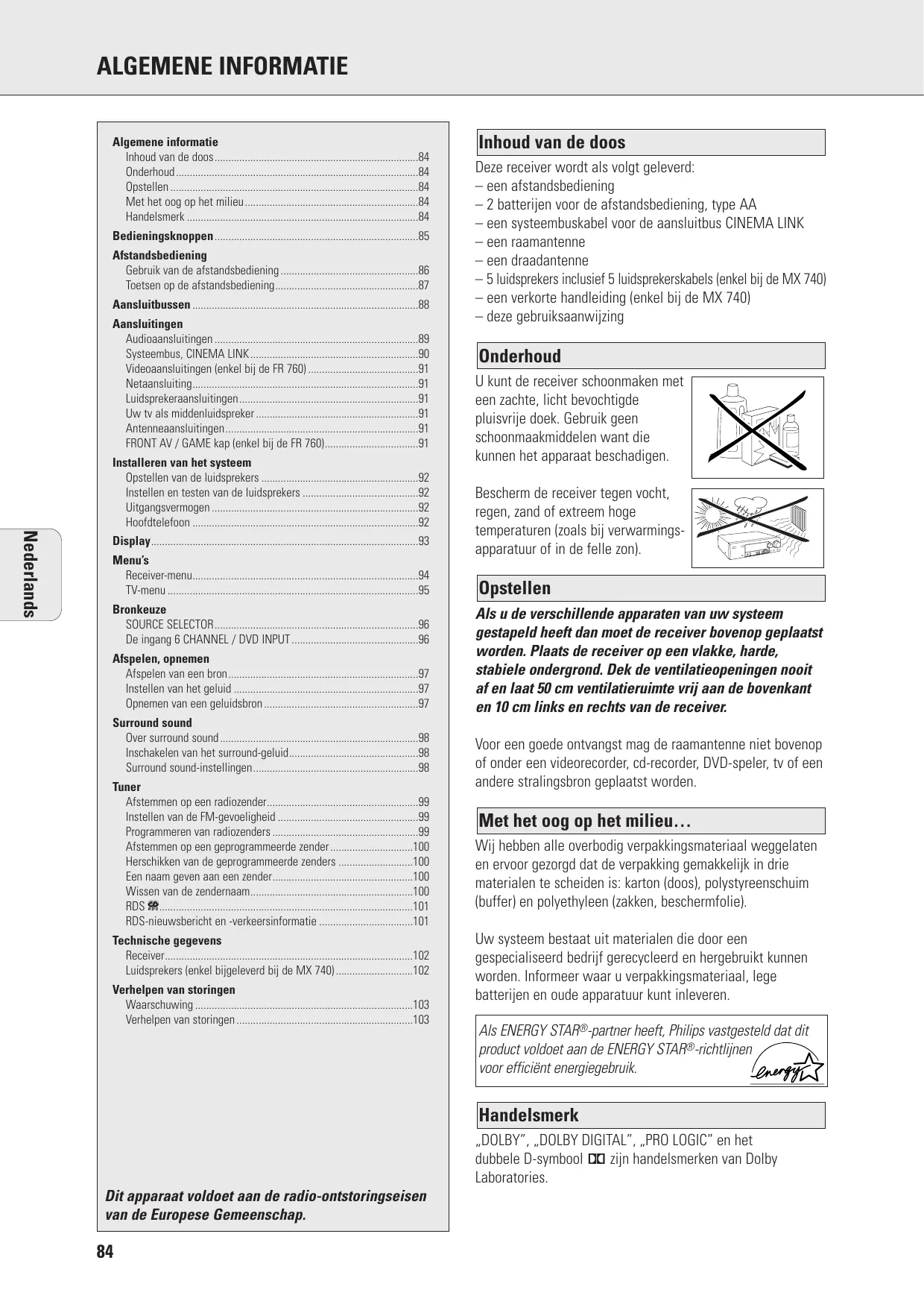 ALGEMENE INFORMATIE Algemene informatie Inhoud van de doos84 Onderhoud84 Opstellen 84 Met het oog op het milieu84 Handelsmerk 84 Bedieningsknoppen85 Afstandsbediening Gebruik van de afstandsbediening 86 Toetsen op de afstandsbediening87 Aansluitbussen 88 Aansluitingen Audioaansluitingen 89 Systeembus, CINEMA LINK90 Videoaansluitingen (enkel bij de FR 760) 91 Netaansluiting91 Luidsprekeraansluitingen91 Uw tv als middenluidspreker 91 Antenneaansluitingen91 FRONT AV / GAME kap (enkel bij de FR 760)91 Installeren van het systeem Opstellen van de luidsprekers 92 Instellen en testen van de luidsprekers 92 Uitgangsvermogen 92 Hoofdtelefoon 92