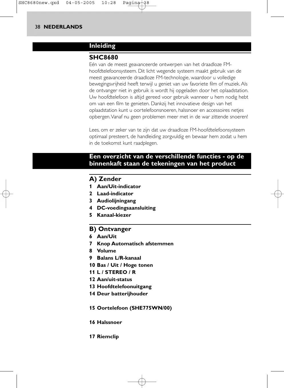 - Alle technische Daten können jederzeit ohne Vorankündigung geändert werden ** Abhängig von Umweltbedingungen Europäische Vorschriften Hiermit erklärt Philips Consumer Electronics, B.U. Peripherals & Accessories, dass dieses FM-Drahtloskopfhörersystem SHC8680 die wesentlichen Anforderungen und andere relevante Bestimmungen der Richtlinie 1999/5/EWG erfüllt. Dieses Gerät wurde konstruiert, geprüft und hergestellt gemäß der europäischen R&TTE-Richtlinie 1999/5/EWG. SHC8680new.qxd 04-05-2005 10:28 Pagina 38 38 NEDERLANDS Inleiding SHC8680 Eén van de meest geavanceerde ontwerpen van het draadloze FMhoofdtelefoonsysteem. Dit licht wegende systeem maakt gebruik van de meest geavanceerde draadloze FM-technologie, waardoor u volledige bewegingsvrijheid heeft terwijl u geniet van uw favoriete film of muziek. Als de ontvanger niet in gebruik is wordt hij opgeladen door het oplaadstation. Uw hoofdtelefoon is altijd gereed voor gebruik wanneer u hem nodig hebt om van een film te genieten. Dankzij het innovatieve design van het oplaadstation kunt u oortelefoonsnoeren, halssnoer en accessoires netjes opbergen.Vanaf nu geen problemen meer met in de war zittende snoeren! Lees, om er zeker van te zijn dat uw draadloze FM-hoofdtelefoonsysteem optimaal presteert, de handleiding zorgvuldig en bewaar hem zodat u hem in de toekomst kunt raadplegen. Een overzicht van de verschillende functies - op de binnenkaft staan de tekeningen van het product A) Zender
