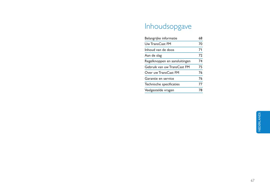 Belangrijk: Lees aandachtig het hoofdstuk"Belangrijke informatie" alvorens de Philips TransCast FM te gelebruiken.